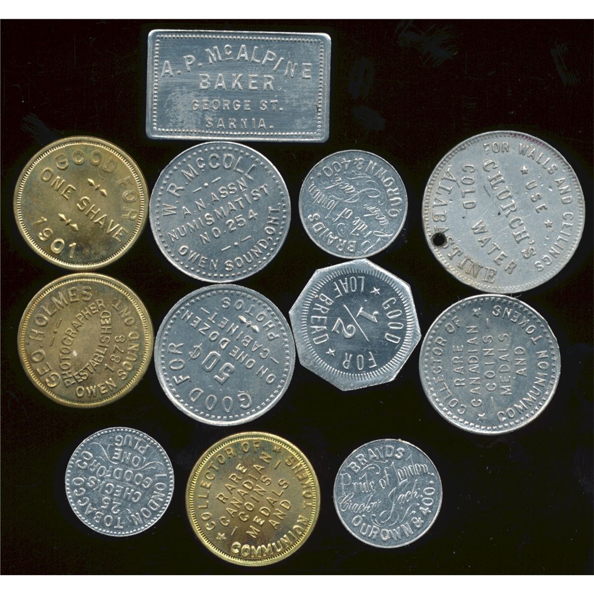 Token Lot; includes Ontario: Bow-768-C-A Unc; Bow-768-D-B & Bx Unc AU; WR McColl McC-829, 830, 833 All AU; McC-188 holed VF; 3 x McC-772 EF-AU. Total of ten (10) pieces.