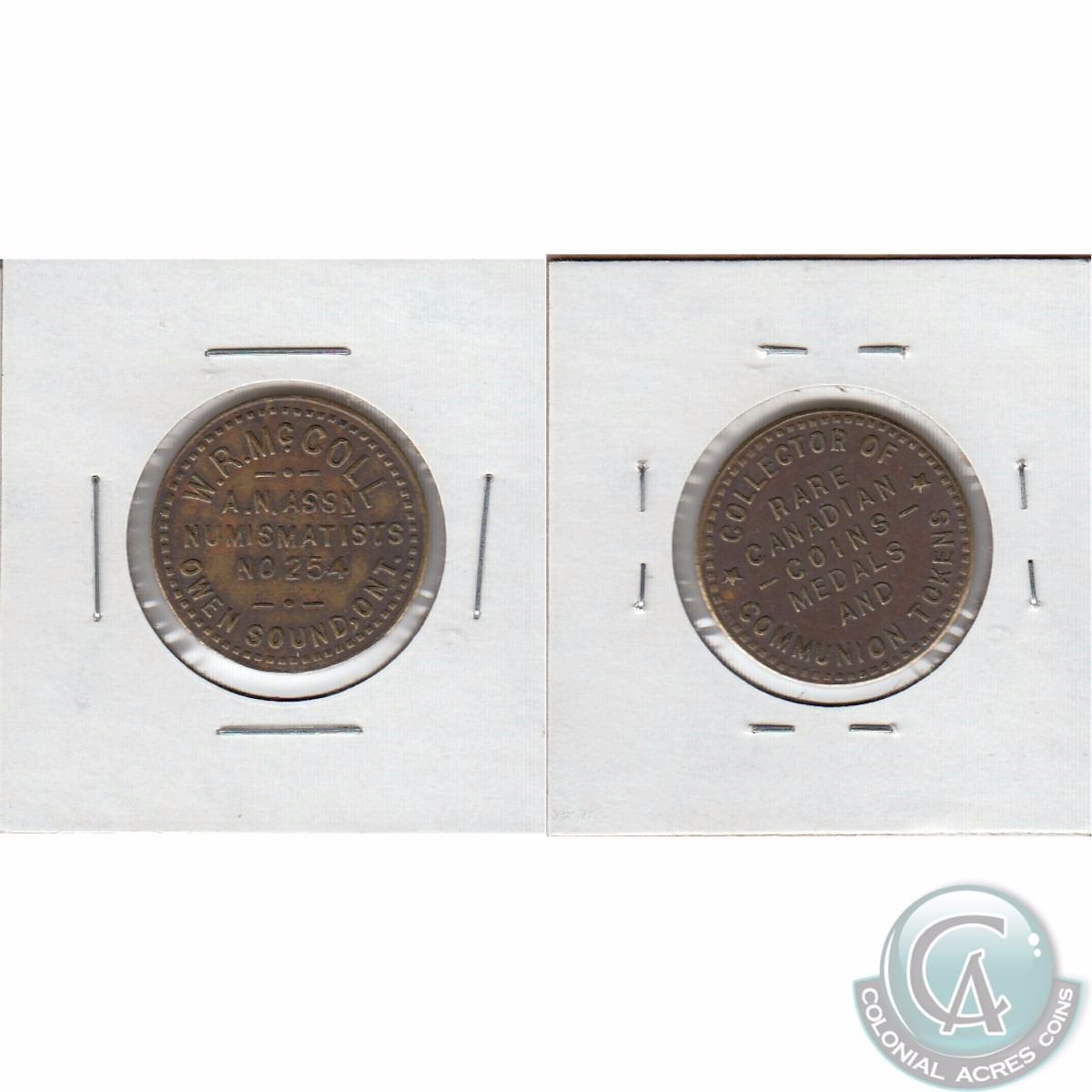 Token: W.R. McColl Owen Sound Ontario, Collector of Rare Canadian Coins, Medals and Communion Token AU Condition. This Token is Brass, weighs 7.37 grams and has a diameter of 25 mm.