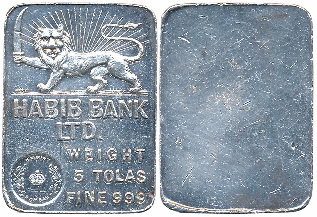 Habib Bank Ltd. Silver, 5 Tolas Token, 58.44g, 999, H. M. Mint, Bombay. Very fine.