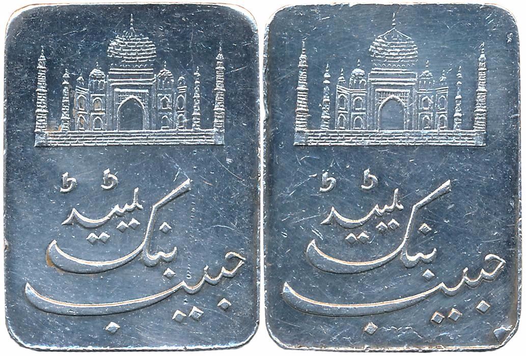 Habib Bank, Silver Bar, 23.45g, Persian legend "Habib Bank LTD" & picture of Taj Mahal above on both sides. Very fine.
