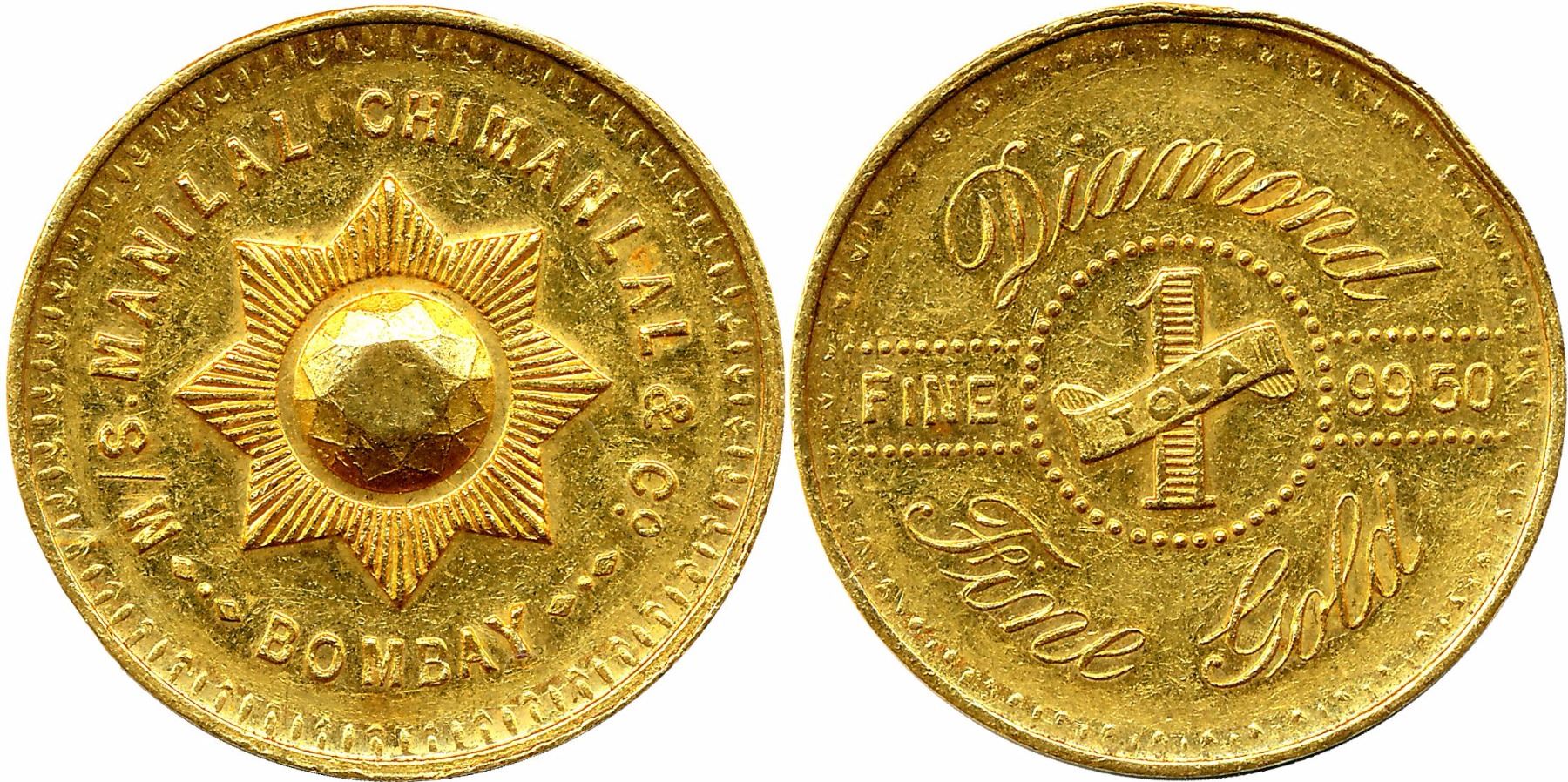 Gold 1 Tola Token, 99.50 Fine, 11.66g, Manilal Chimanlal & Co. Bombay, Diamond type, plain edge. Very fine+.