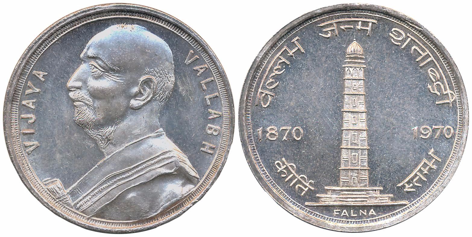 Jain Silver Token, 19.96g, “Birth Centenary of Acharya Vijay Vallabh Suri”, 1970, struck at Falna (Rajasthan), Obv: Portrait of Acharya, Rev: Kirti Stambha of chittorgadh, Date & Place. Very fine.