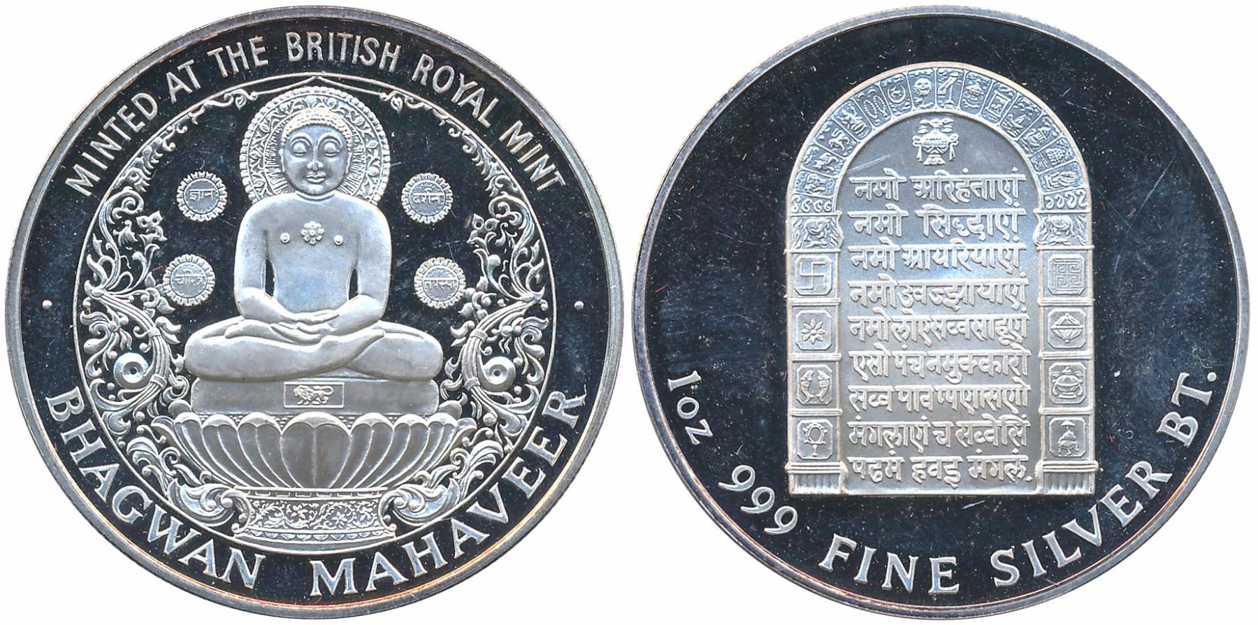 Bhagwan Mahavir Swami, Silver Token, 31.11g, struck at British Royal Mint, Obv: Portrait of Bhagwan Mahavir Swami seated on a lotus, Rev: Navakara mantra within an arch, vertical milling. Uncirculated, rare.