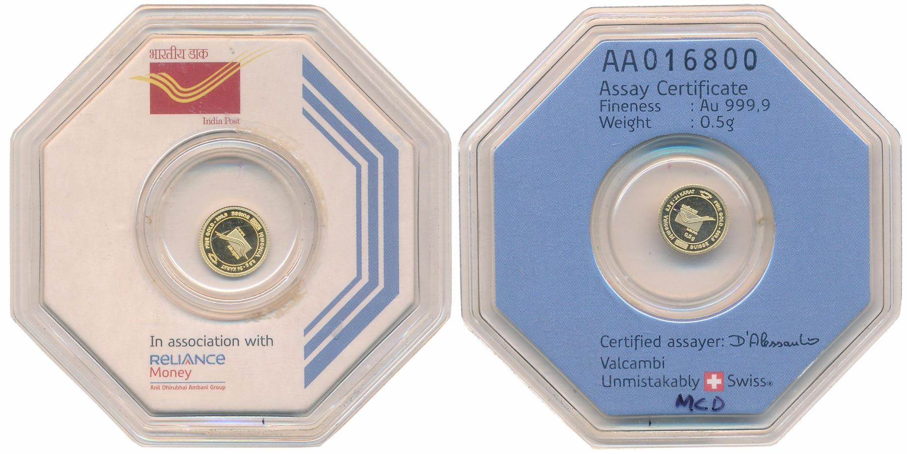 India Post, Gold Token, 0.50g, Indian Post Logo on both side along with legend, In original packing with Assaye Certificate. Uncirculated.