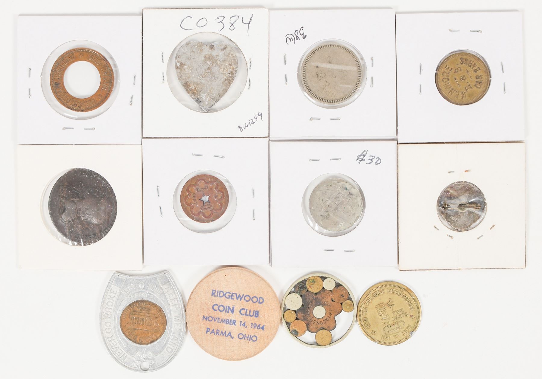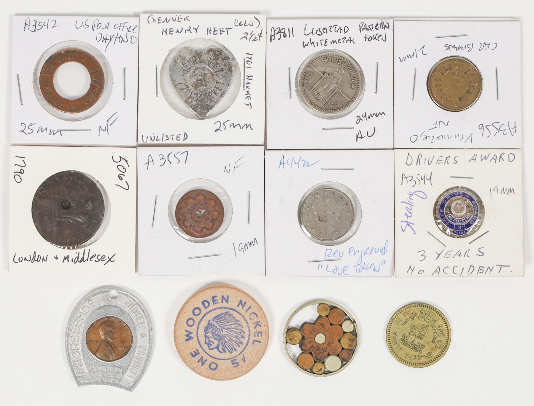 An interesting group of twelve tokens and gaming counters including a wooden nickel, a lucky penny imbedded horseshoe, a Safe Driver Award lapel pin, heart shaped token, some pierced. One item is an assemblage of very miniature coins held in a round frame by a six-scalloped coin custom-made for the job.
