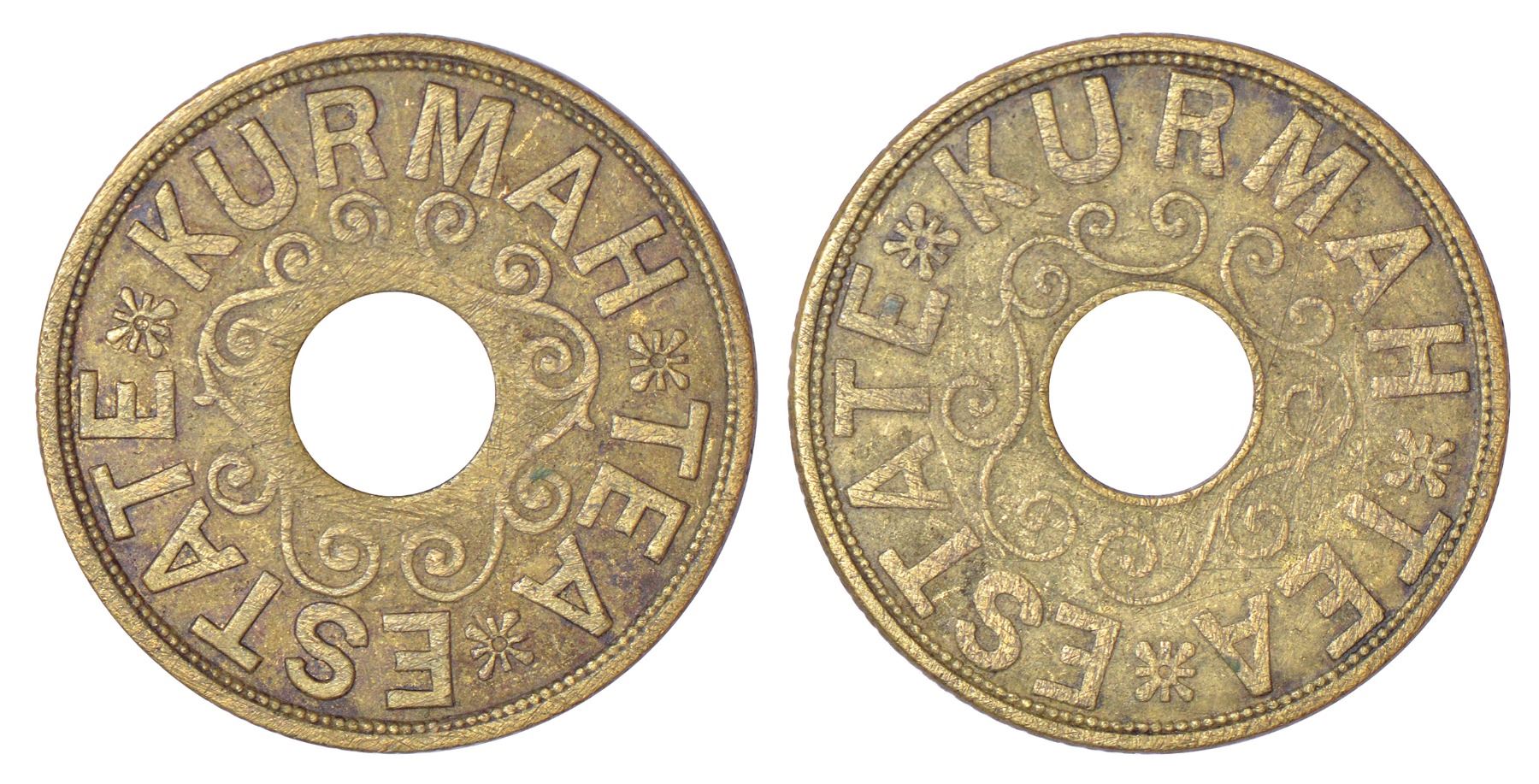 British India Assam Tea garden token, brass, Kurmah Estate, unlisted in PR, 8.24g. Obv: Centre-hole, around legend, floral design with legend KURMAH TEA ESTATE around. Rev: Same as obverse.