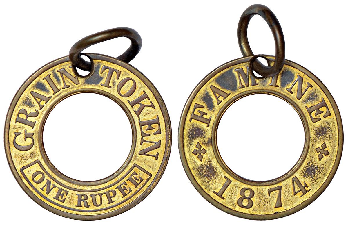 Tokens: British India, Bengal Famine Relief Work, brass grain token, 1 rupee, Calcutta, 1874, 4.08g.