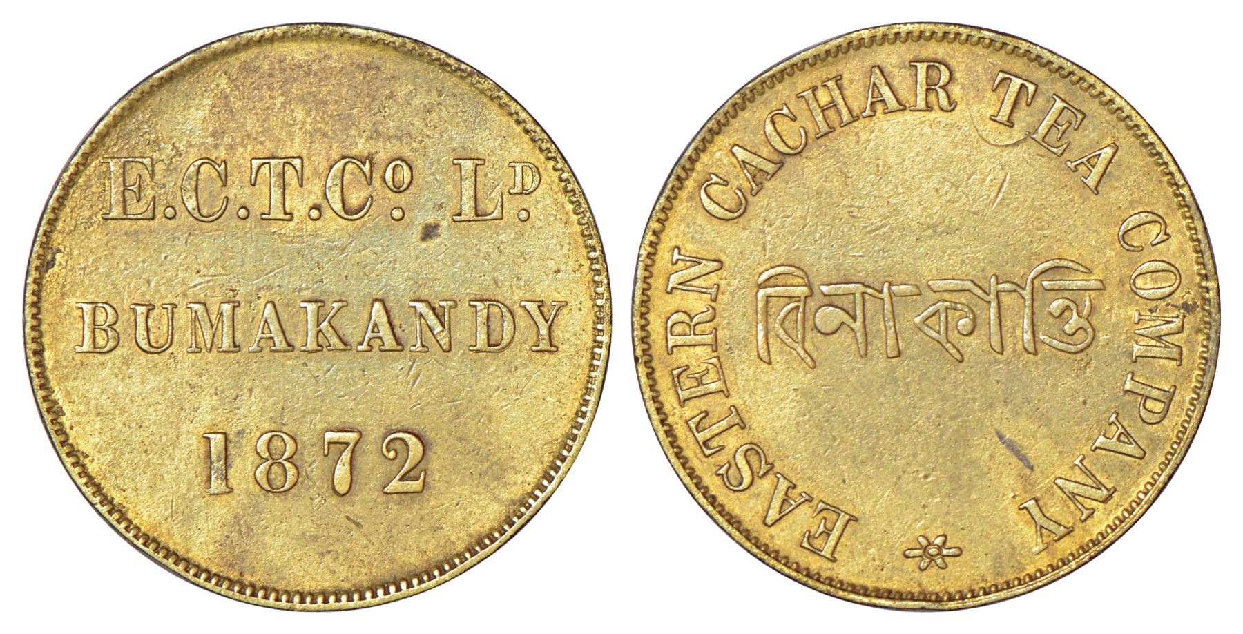 Bumakandy Garden (Assam), Tea Garden Token, Brass, 5.42g. Obv: E.C.T.Co, LD. BUMAKANDY 1872. Rev: EASTERN CACHAR TEA COMPANY in English and "বিনাকান্তি" (BINAKANTI) in Bengali in center with star at bottom. One of the rarest Tea Garden Token where Company name, English Language, Regional Language and Date of issue all are mentioned. 26mm, PR 18, Refer Bose 16.