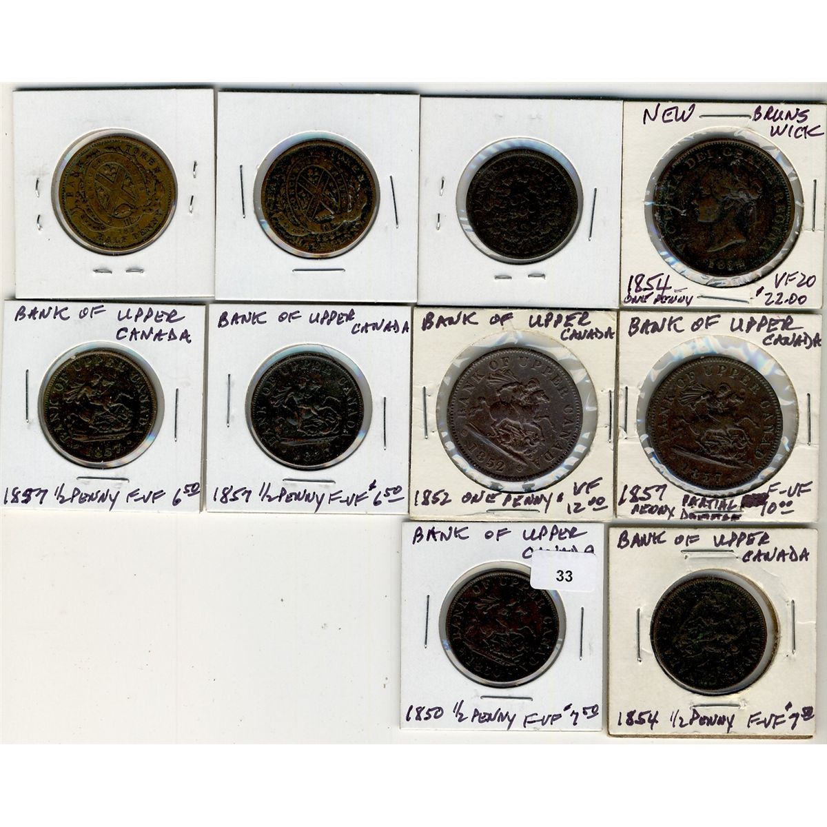 Tokens; Lot includes, Upper Canada Tokens((6), New Brunswick, Lower Canada & Province of Canad(2). 10 pcs all VG to VF.