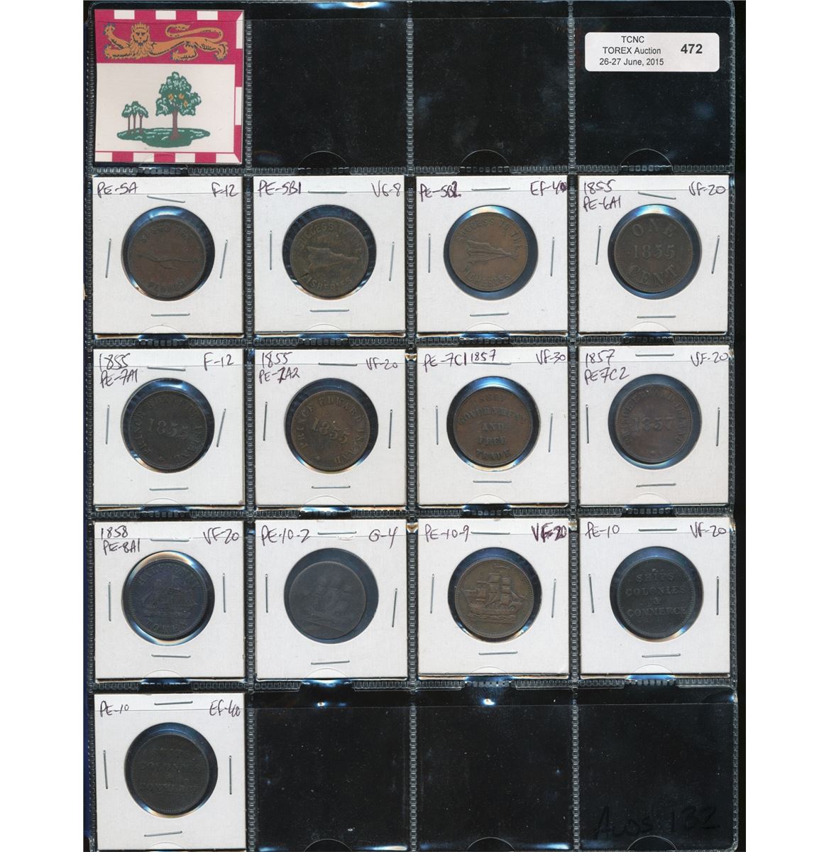 Tokens, PE-5A F, PE-5B1 VG, PE-5B2 EF, PE-6A1 VF, PE-7A1 F, PE-7A2 VF, PE-7C1 VF-30, PE-7C2 VF, PE-8A1 VF, PE-10-2 G, PE-10-9 VF, PE-10 VF, PE-10 EF. Lot of 11 Tokens all identified in 2x2's, viewing is recommended.