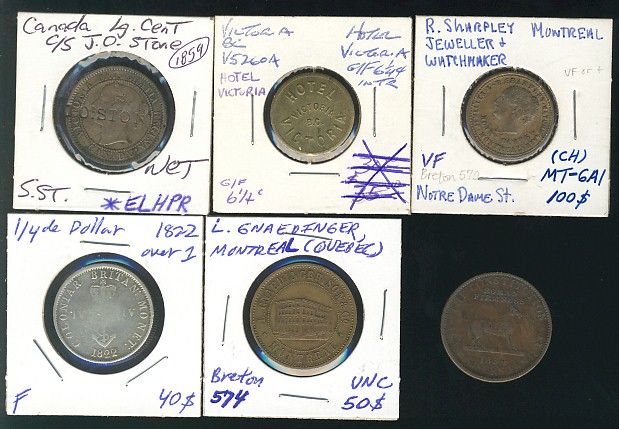 Tokens, small lot including 1822 Anchor $_ 2/1, Br:574 Gnaedinger, R. Sharpley Jewellery & Watchmaker (Montreal), Hotel Victoria token, Hard Times HT-25 issue & 1859 1¢ w/overstamp J.O. Stone. Intriguing lot of 6 pcs that should be viewed.