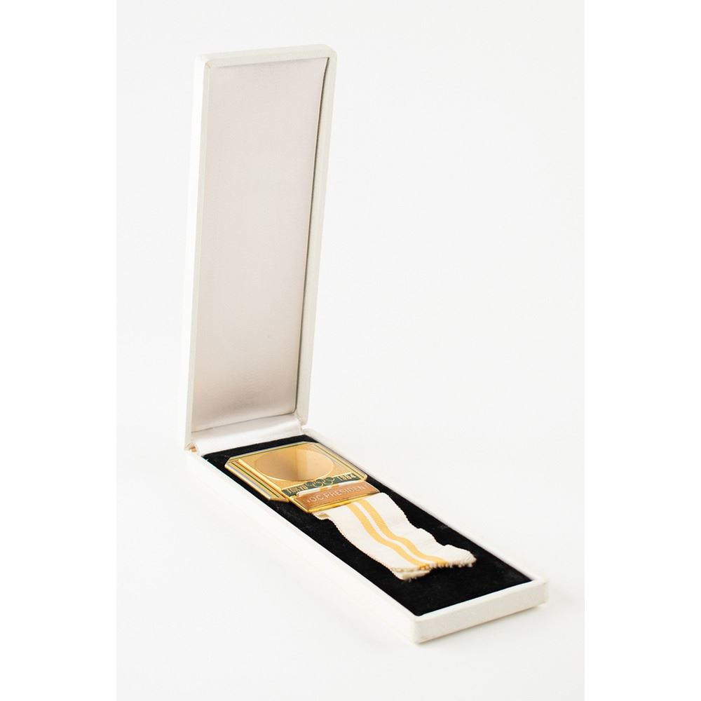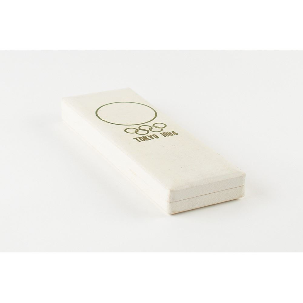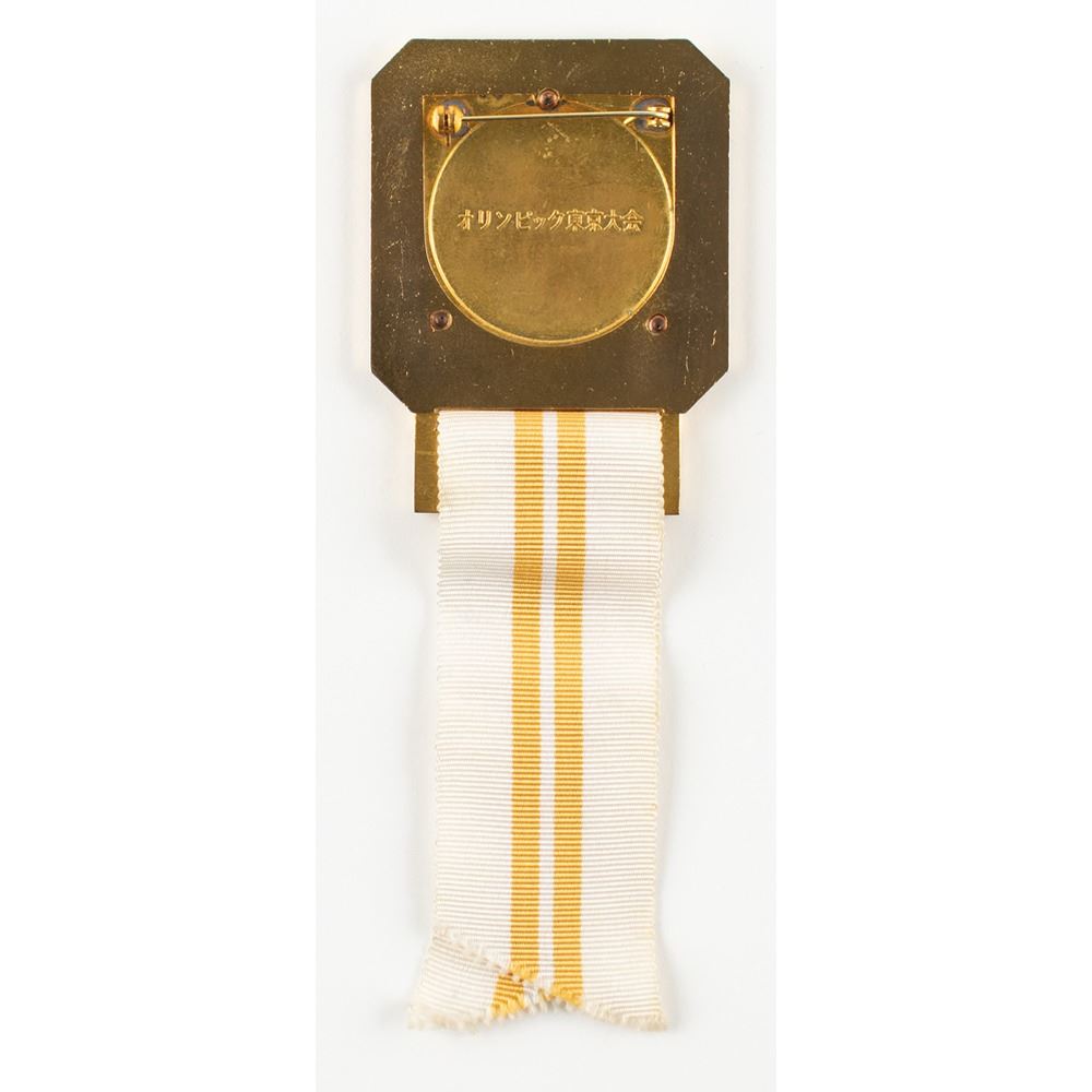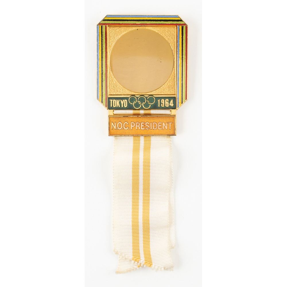 Rare official National Olympic Committee president's badge issued for the 1964 Tokyo Summer Olympics. Gold-plated, 50 mm x 67 mm, 62 gm, with the yellow-striped white double ribbon measuring 80 mm in length. The badge features the rising sun of the Japanese national flag bordered by bands in the colors of the Olympic rings, with an orange enamel bar below reading: "N.O.C. President.†Accompanied by its original white leather presentation box.