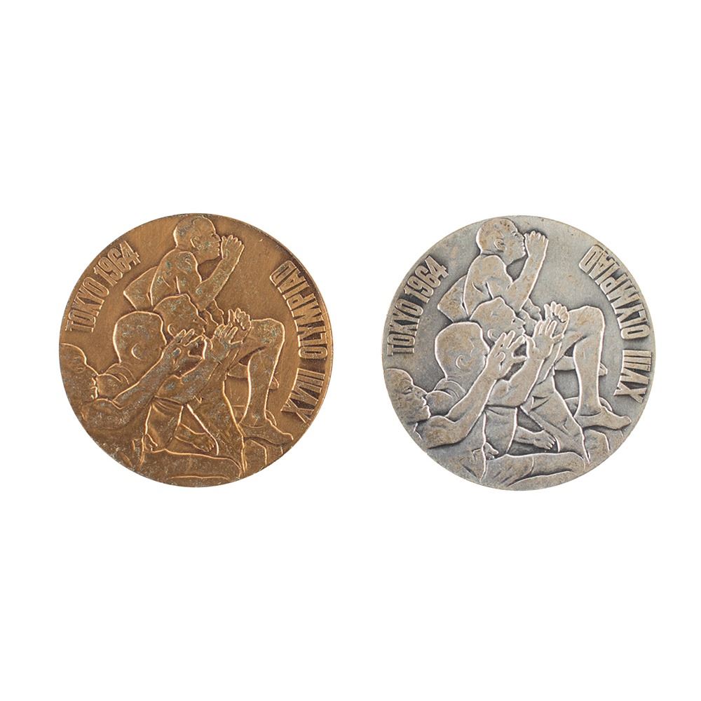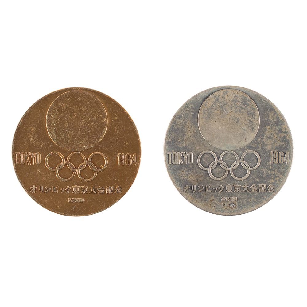 Silver and copper commemorative medals issued by the Tokyo Olympic Fund Raising Association for the Tokyo 1964 Summer Olympics. The medals—silver (32 mm, 19 gm, 925/1000) and copper (32 mm, 16 gm)—feature a front design of several runners with embossed text: “Tokyo 1964, XVII Olympiadâ€; and the reverse features the official Tokyo Games logo above Japanese text.