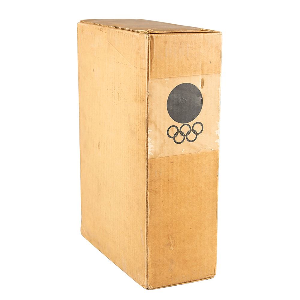 Scarce book set: The Games of the XVIII Olympiad, Tokyo 1964: The Official Report of the Organizing Committee, Vols. 1–2. Tokyo: Kyoto Printing Co. Hardcovers in their original slipcase, 8.5 x 12, totaling 1358 pages plus one folded map. The first volume chronicles preparations for the Games; volume two documents the athletic events and their results. Book condition: VG/None in a VG slipcase, with bumped corners and minor wear to boards. Accompanied by the original cardboard box.
