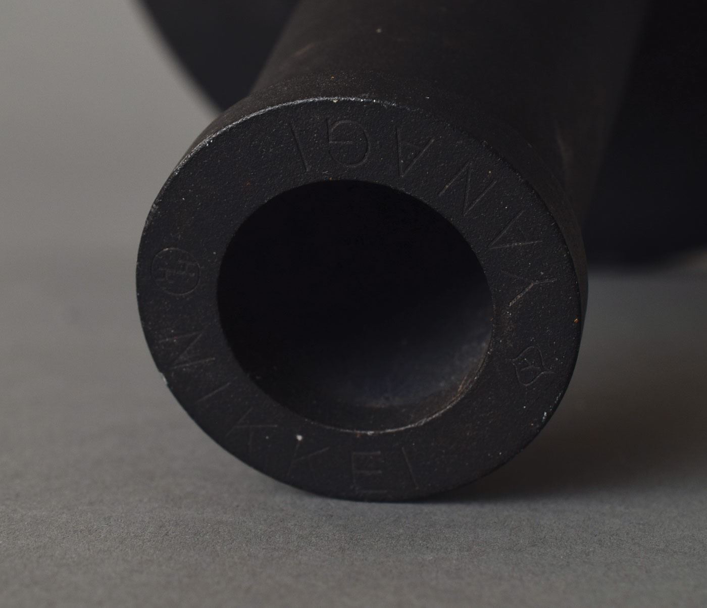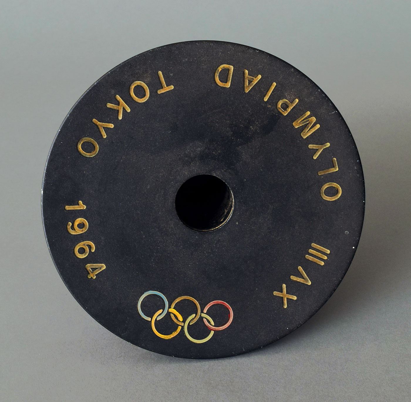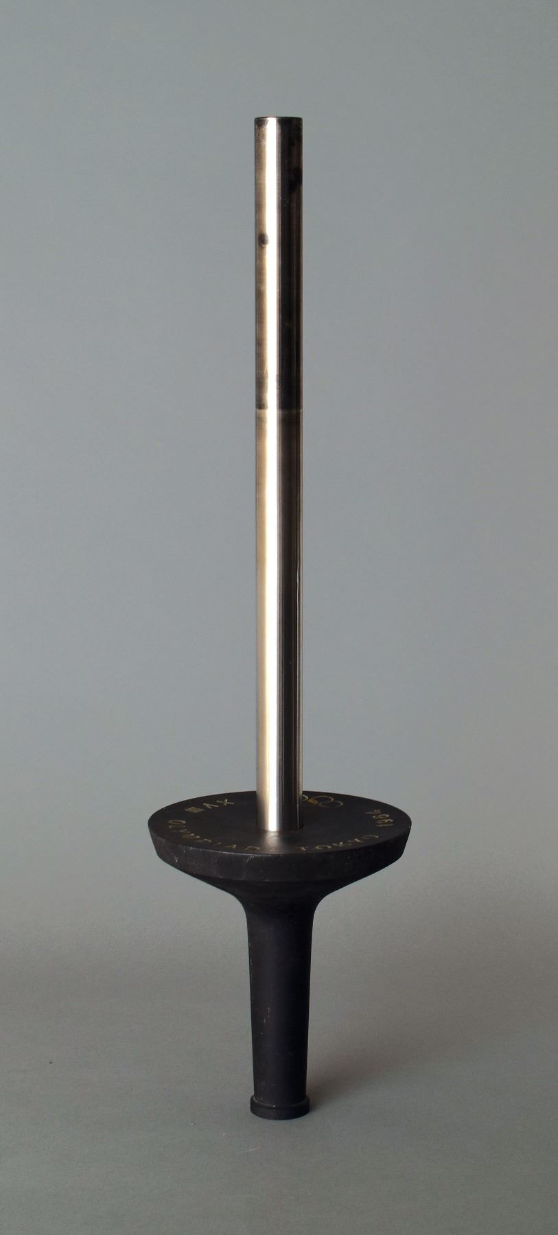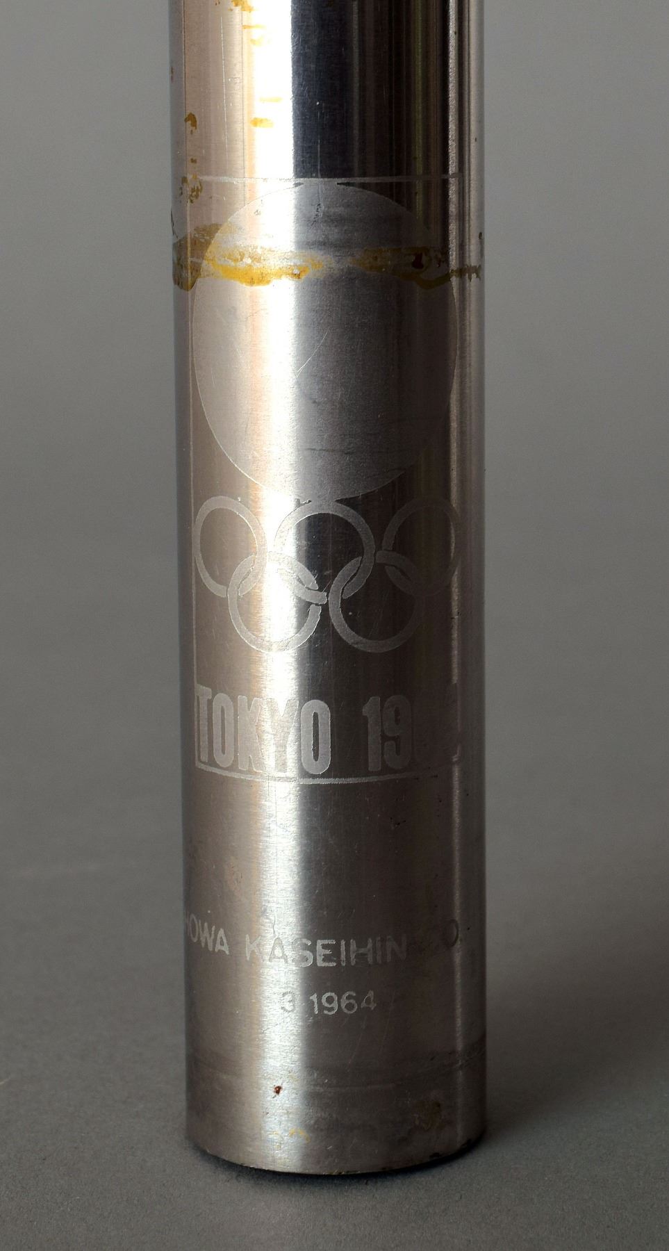 Official 1964 Tokyo Olympics torch, consisting of a blackened aluminum alloy bowl and a stainless steel cylinder, measuring 25.5? in length and 6.75? at its widest point. Manufactured by Nippon Light Metal Co., the bowl is engraved "XVII Olympiad Tokyo 1964" with a set of Olympic rings, and the lower portion of the cylinder bears the Tokyo Games logo and reads "Showa Kaseihin Co., Ltd., 3-1964." Some scattered nicks and dings to the bowl and cylinder, and upper portion of the cylinder notably darkened and discolored. The Olympic torch was carried for 51 days by 870 runners for a total of 26,065 kilometers. Designed on the principle of the coal-mine safety lamp, the Tokyo Olympic torch was filled with priming powder and fumigant, a two-component ignition material that needed to be wind and rain resistant, and which could both easily ignite and extinguish. Its effect was similar to that of a flare, and it proved a safe and reliable instrument over the course of its hemisphere-trotting relay. Although a typhoon and various plane issues caused a one-day delay late in the schedule, the triumphant final relay by Yoshinori Sakai through Tokyo's National Olympic Stadium on October 10, 1964, served as a defining moment for a still healing post-war Japan. This torch beautifully represents the moment the fifth ring of the Olympiad touched down on Asian soil.