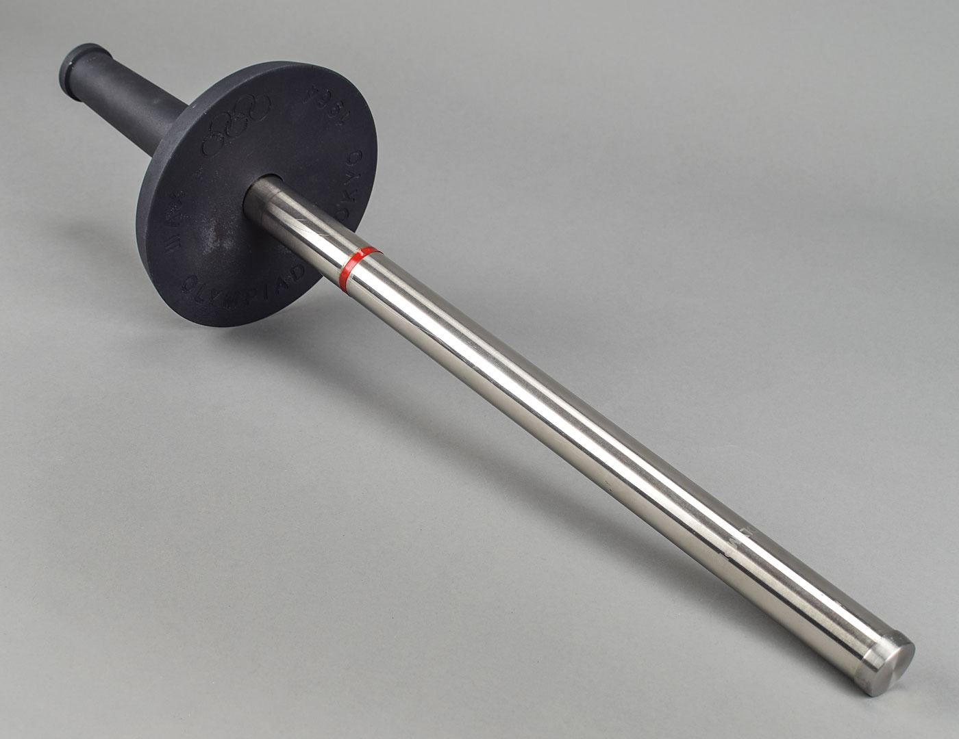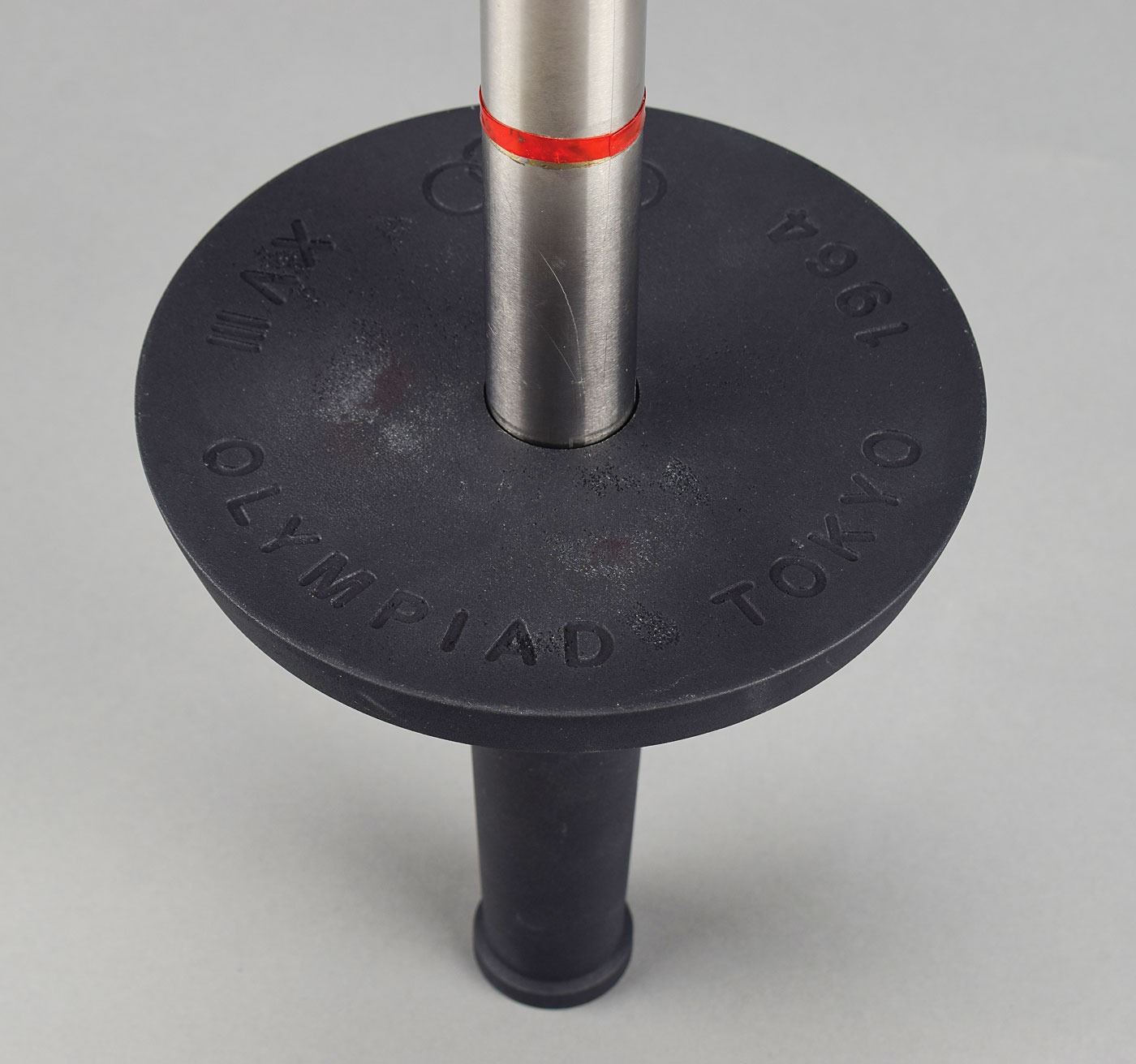 Official 1964 Tokyo Olympics torch, consisting of a blackened aluminum alloy bowl and a stainless steel cylinder, measuring 25.5? in length and 6.75? at its widest point. Manufactured by Nippon Light Metal Co., the bowl is engraved "XVII Olympiad Tokyo 1964" with a set of Olympic rings, and underside of handle marked: “Nikkei Yanagi.” The lower portion of the cylinder bears the Tokyo Games logo and reads "Showa Kaseihin Co., Ltd., 3-1964," with upper section marked: "Olympic Torch." Some scattered nicks and dings to the bowl and cylinder, wear to the top platform of the bowl, and adhesive remnants visible below cylinder's red band.