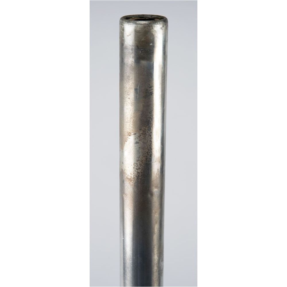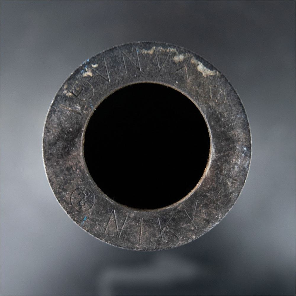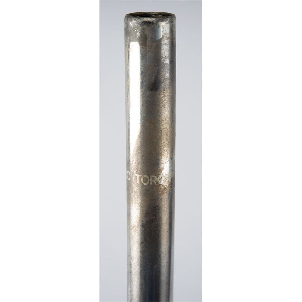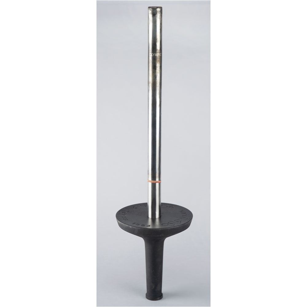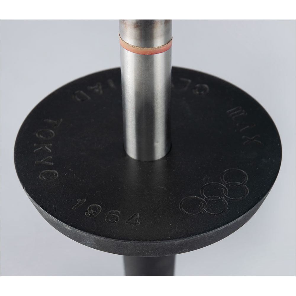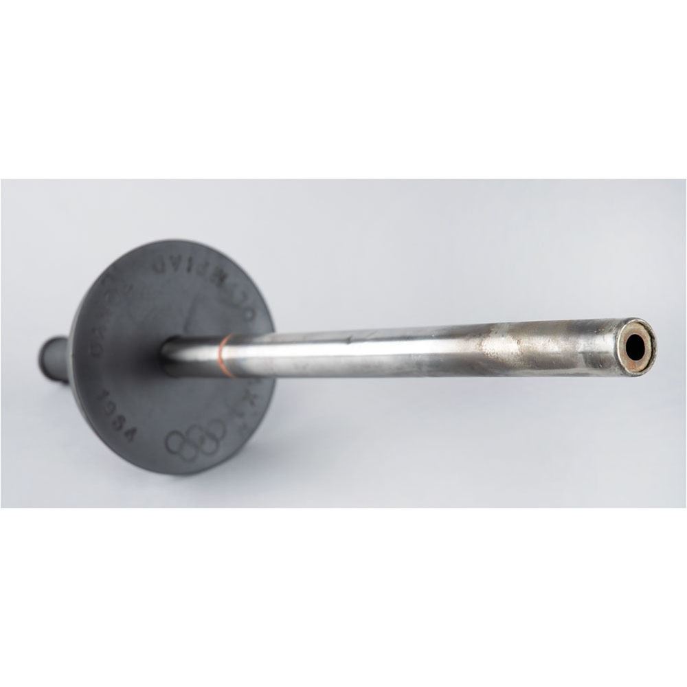Official 1964 Tokyo Olympics torch, consisting of a blackened aluminum alloy bowl and a stainless steel cylinder, measuring 25.5″ in length and 6.75″ at its widest point. Manufactured by Nippon Light Metal Co., the bowl is engraved "XVII Olympiad Tokyo 1964" with a set of Olympic rings, and underside of handle marked: “Nikkei Yanagi.†The lower portion of the cylinder bears the Tokyo Games logo and reads "Showa Kaseihin Co., Ltd., 3-1964," with upper section marked: "Olympic Torc[h]." Exhibits burn marks, nicks, and dings to the burner cylinder, adhesive remnants around the cylinder's red band, and wear to the top platform of the bowl.