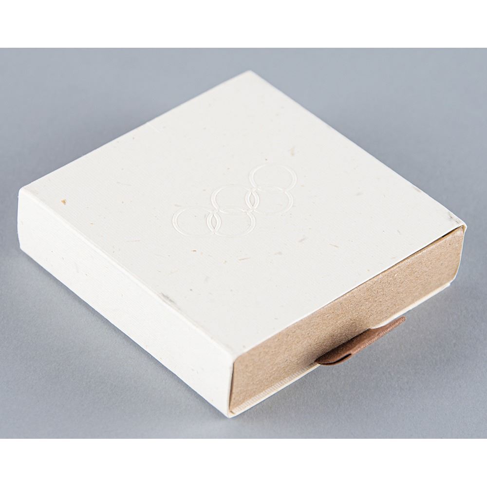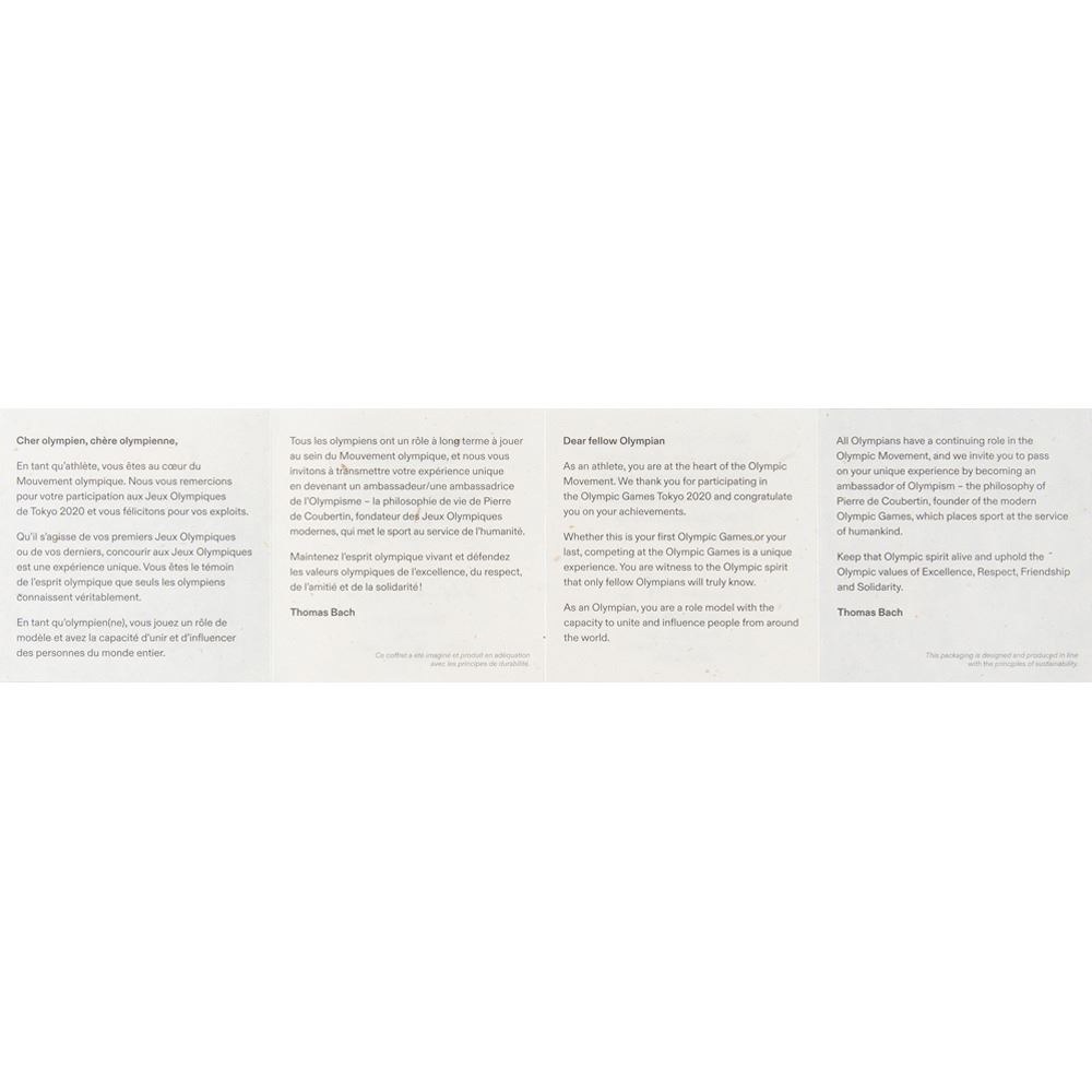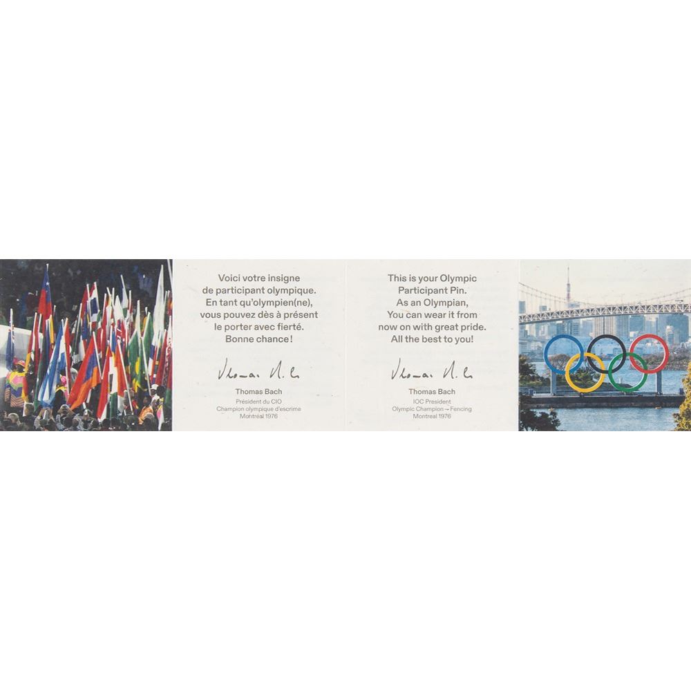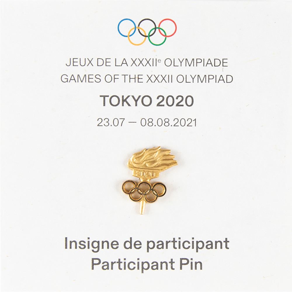 Official gold-plated participation pin from the Tokyo 2020 Summer Olympics. 1 gm, 12 mm x 19 mm, which features the Olympic rings under a flaming 2020 torch. Reverse features the mint mark, "Bertoni, Milano," and the serial number, "20-05522." Includes the original paper presentation box with matching label, which bears some slight scuffing. As no participation medals were issued for the 2020 Tokyo Games, the athlete’s participation pin has become the de facto 2020 Tokyo 'participation medal' for collectors.