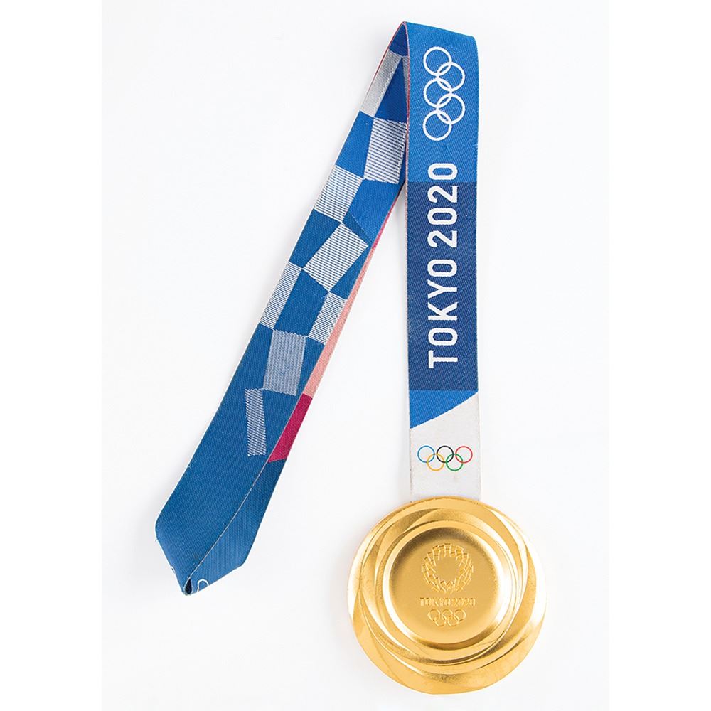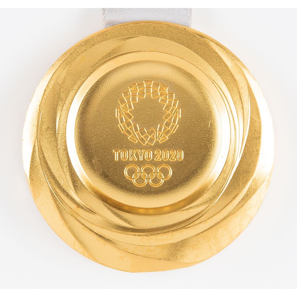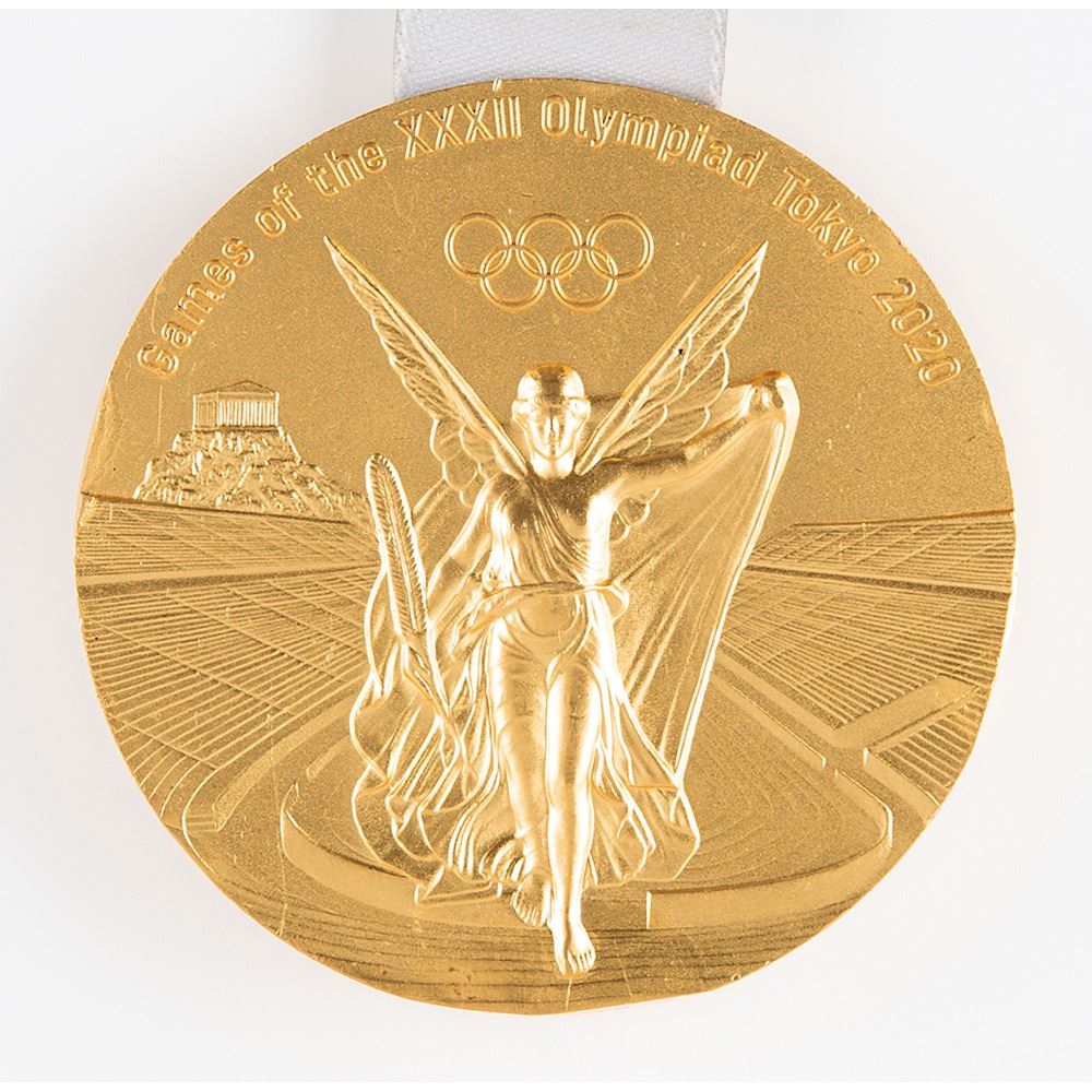 Rare gold winner’s medal issued for the Tokyo 2022 Summer Olympics. Gilt silver, 86 mm, 556 gm, by Junichi Kawanishi. The front of the medal features text across the top, “Games of the XXXII Olympiad London 2020,†above the Olympic rings and a winged Nike flying over Panathinaikon Stadium with the Acropolis in the background; the reverse features the emblem of the Tokyo Games set against a ‘polished stone’ background with surrounding curved lines that represent different patterns of light and the energy of the athletes and their supporters. Retains its original multicolored ribbon, which bears traditional Japanese design motifs found in ichimatsu moyo (harmonized chequered patterns) and kasane no irome (traditional kimono layering techniques) in a modern format. The event, which is inscribed along the bottom edge of the medal, will be disclosed to the winning bidder. The medal bears trivial scuffs and marks. Includes the official Tokyo 2022 identification card issued to the gold medal-winning athlete. A robust and resplendent winner’s medal from the most recent Summer Olympiad, and the historic first occasion of a Tokyo 2022 gold medal being offered at auction.