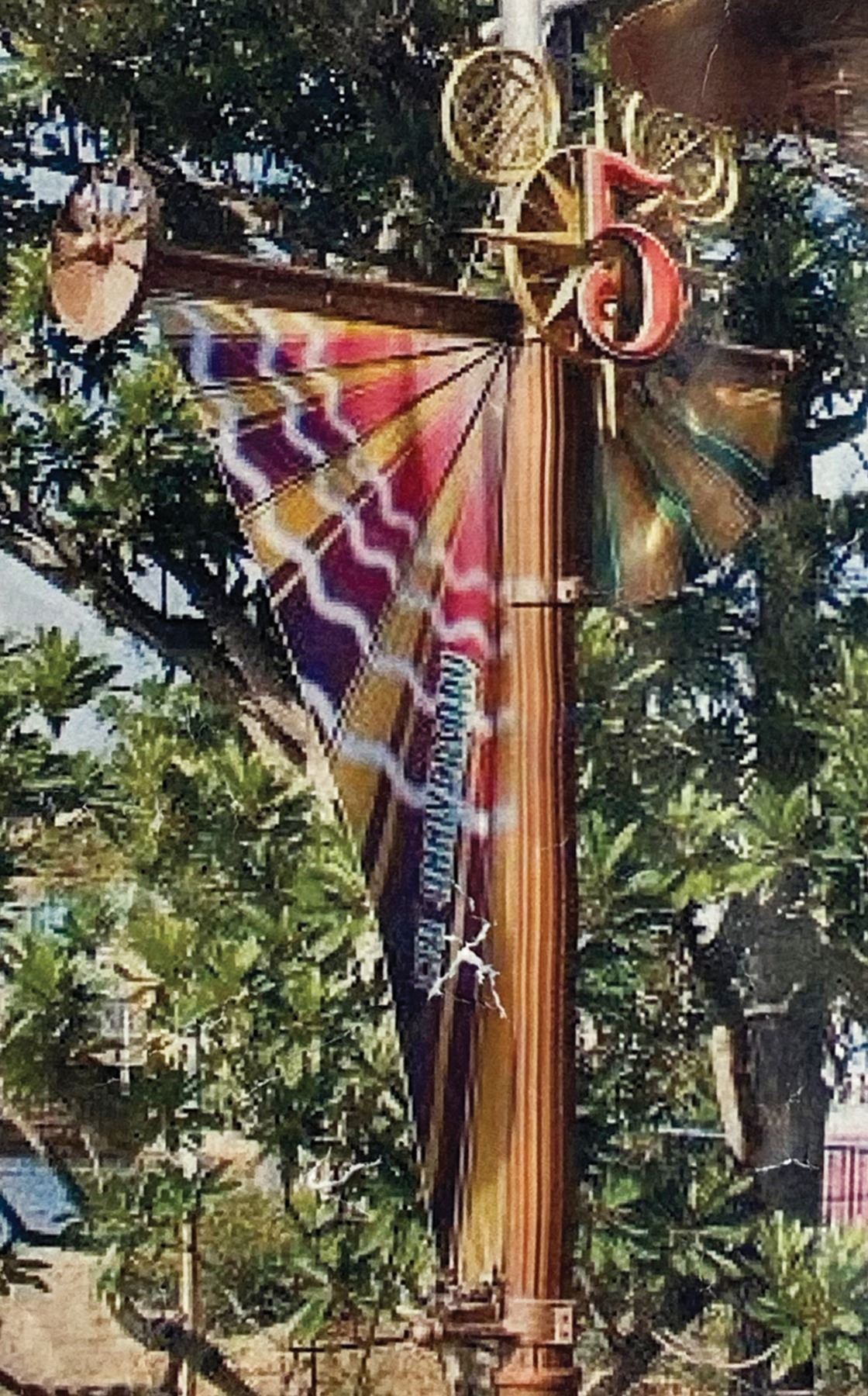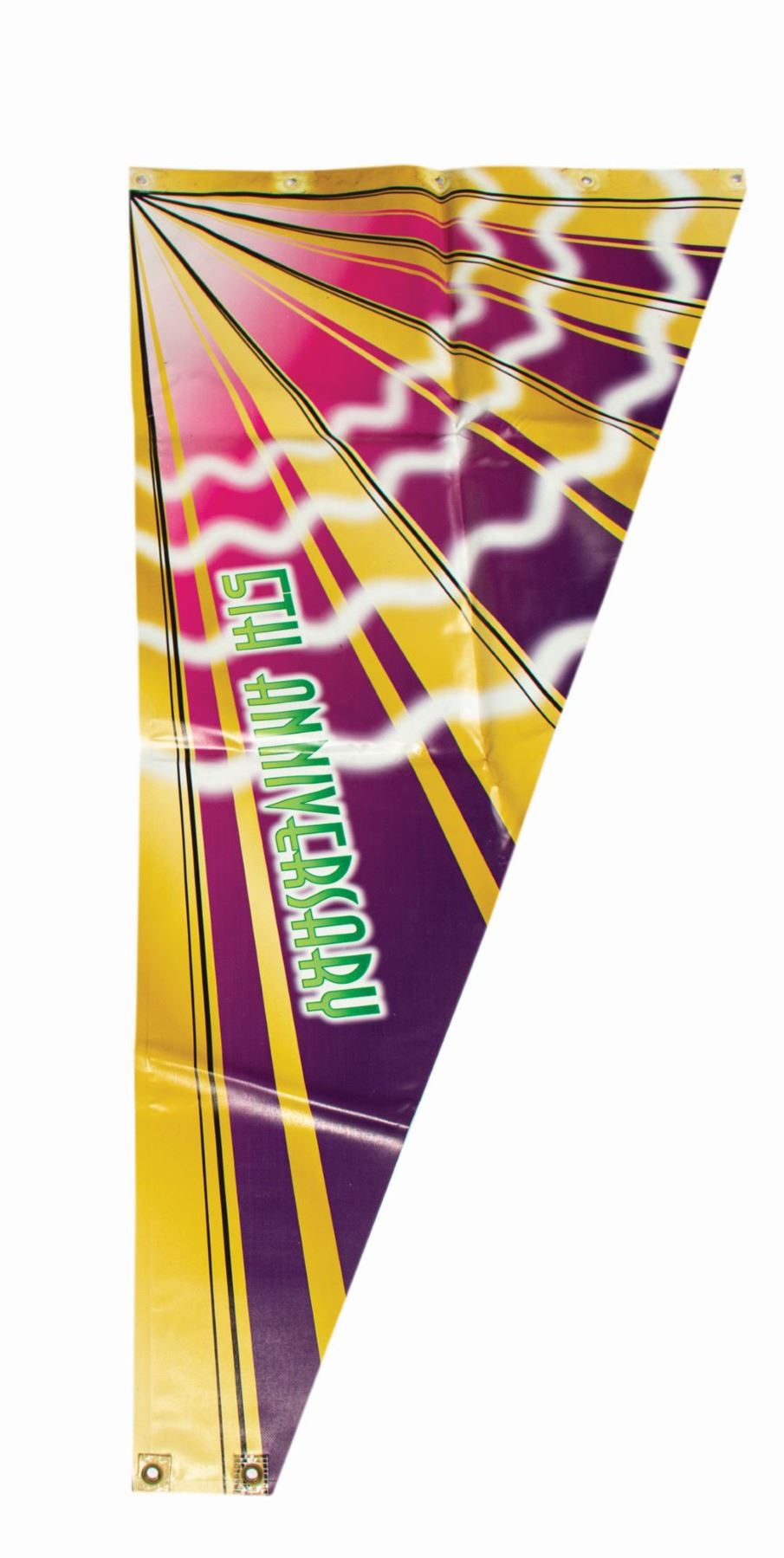 (Tokyo DisneySea, 2006) An original park-used 5th Anniversary sign and banner from the Port Discovery port-of-call at Tokyo DisneySea. The futuristic sign is constructed resin, fiberglass, and mixed media and the reverse is equipped with heavy gauge screws for hanging. The asymmetrical banners are constructed of vinyl and printed on both sides with metal spokes and electrical current graphics. The top and bottom of each banner features holes for hanging, though most metal grommets have been removed. The sign measures 22”x20” and 4” deep and the banners are 21”x15.5” and 54.5”x23” respectively. The sign is in fine condition with only minor park wear while the signs are in very good condition with some soiling from outdoor use.