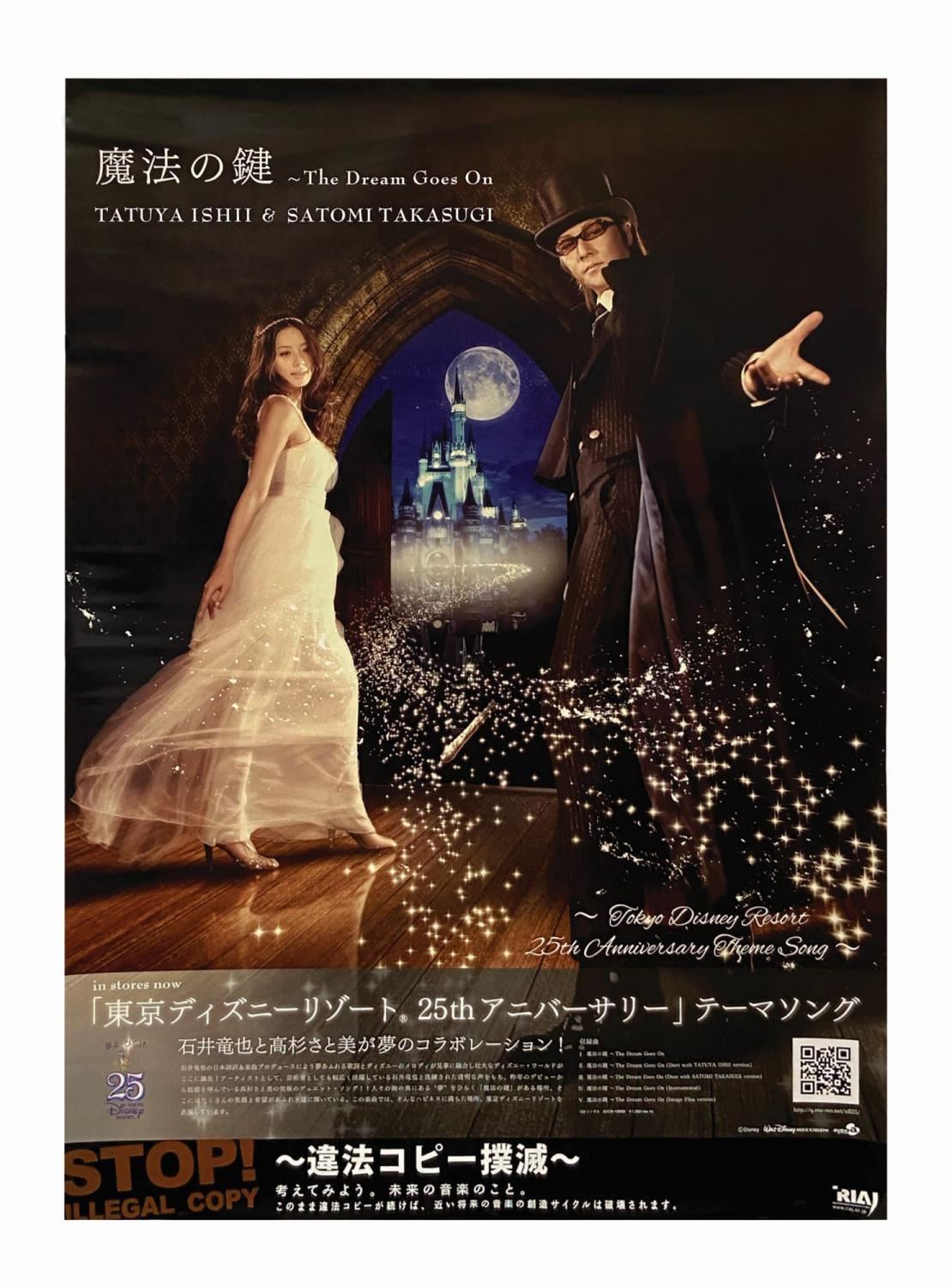 (Tokyo Disneyland, 2008) A rare poster created to celebrate Tokyo Disneyland's 25th anniversary. This poster was used in promotion of the park's 25th anniversary theme song, The Dream Goes On, by Tatuya Ishii and Satomi Takasugi. Measuring 28.75"x20.25", the poster is in good condition with minor edge and handling wear.