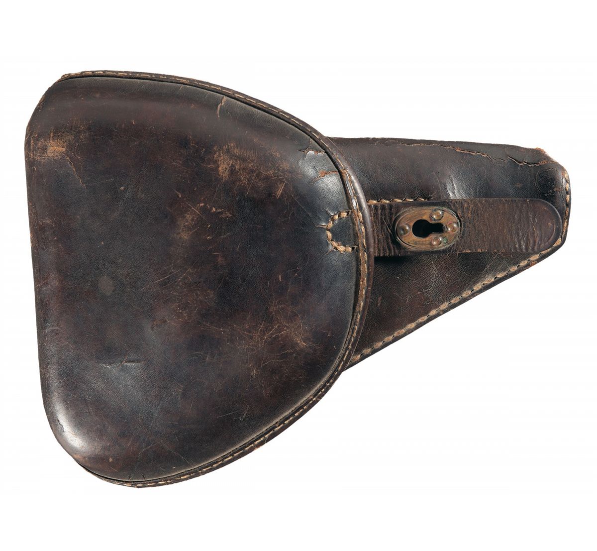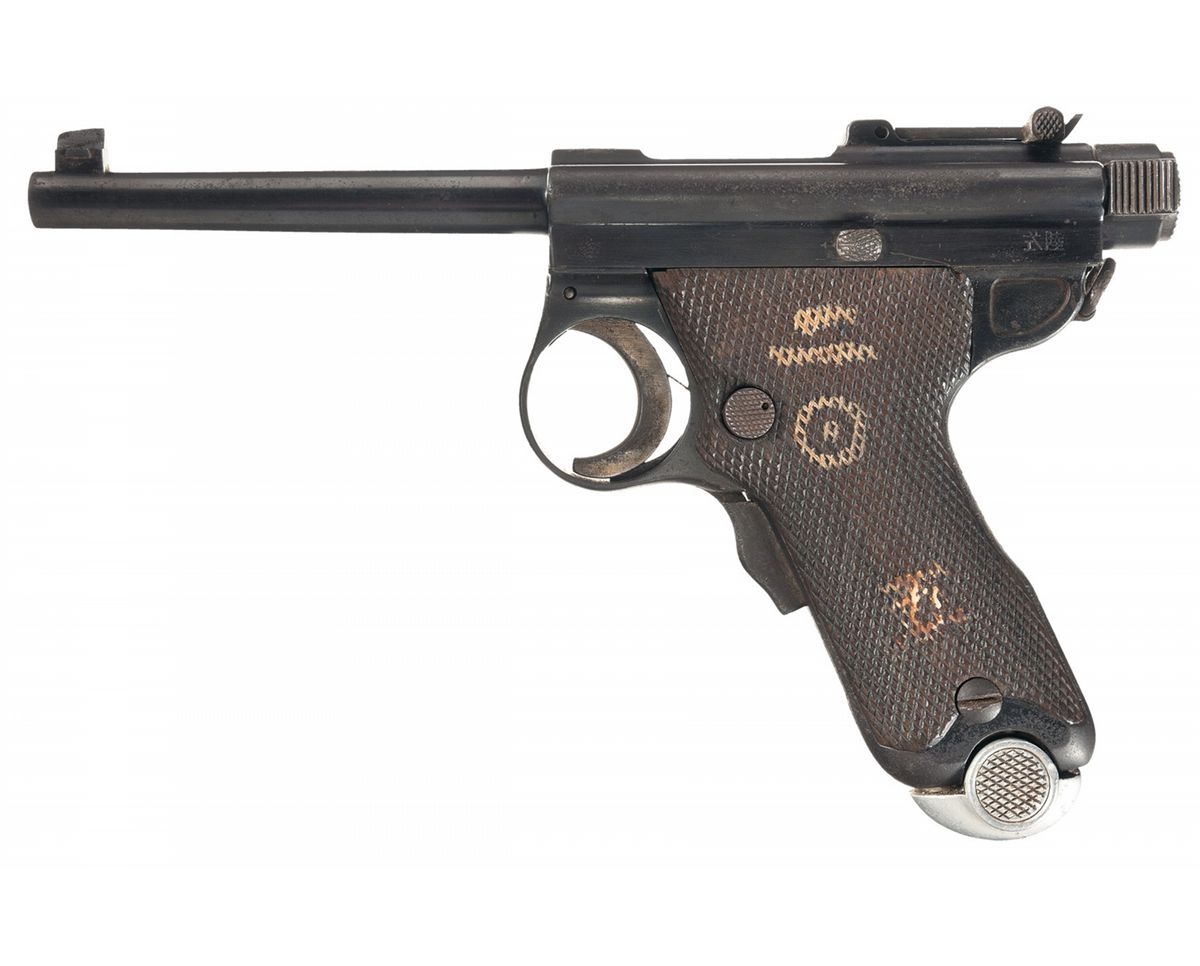 One of only 550 manufactured between 1925 and 1928 as part of the second assigned serial number range by the Tokyo Gas and Electric Company. Numbered from 8,000 to 8,549, it is one of the rarer Papa Nambu contract pistols. Blade front and tangent rear sights, with the "GTE" mark on top of the extension, and the Tokyo Arsenal mark, model markings and serial number on the right. Matching numbers are present on the bolt and cocking knob. Fitted with checkered hardwood grips, painted symbols on the left panel, a smooth grip strap and nickel finished, alloy base magazine. With a brown leather clamshell flap holster.