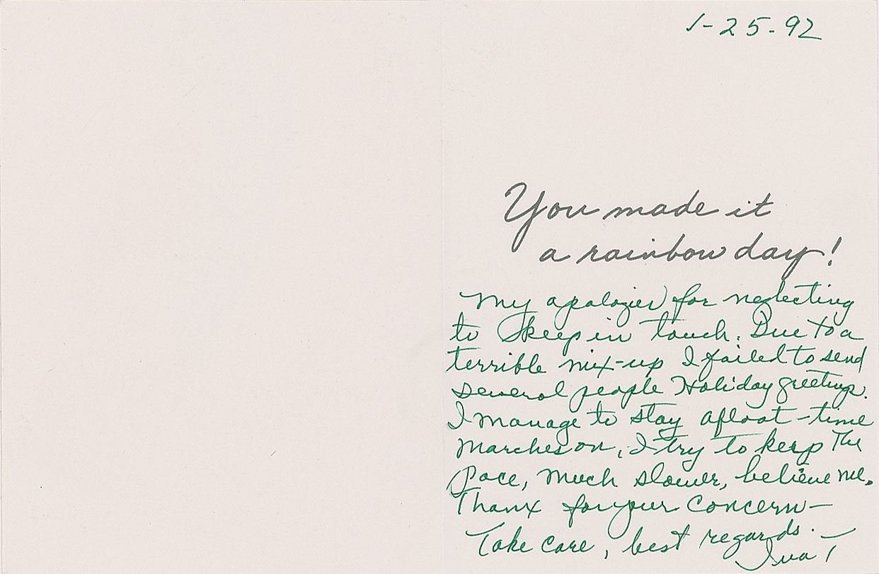 ALS signed “Iva T,” one page, 4 x 5, January 25, 1992. Letter inside a greeting card, in part: "Due to a terrible mix-up I failed to send several people Holiday greetings. I manage to stay afloat—time marches on, I try to keep the pace, much slower, believe me." In fine condition. Accompanied by a full letter of authenticity from PSA/DNA, as well as the original mailing envelope addressed in her own hand.
