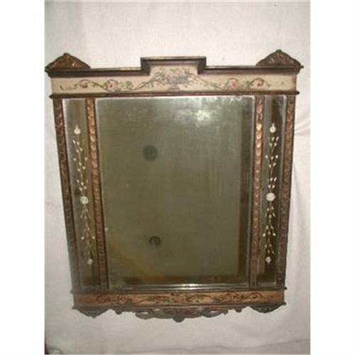 Tole hand painted wooden mirror C.1885-1900 has wonderful coloring of rose,blue,green and yellow in the floral swags across the pediment style top and bottom,accented with antique cream background. The leaf design frame is old gilt almost to a bronze hue. Mirror is in three sections with wonderful etching on the two side panels. The center solid section has a couple of spots of silver showing through at top and can be replaced with a new one if desired due to the indivdual panels. We thought quite appropriate to leave as reflects wonderfully and goes with the overall aged character. One small piece of trim missing from the bottom swag on right side. Structurally sound with the old nails and paper on back. A wonderful accent wherever hung. Measures 28L X 32.5H X 1D.
