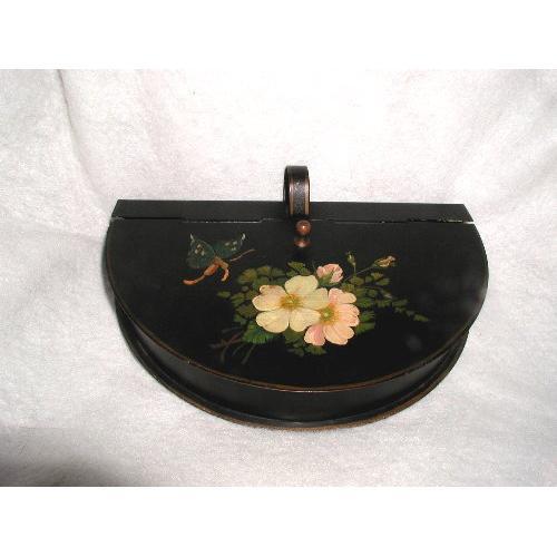 </font></strong>Demi-lune shaped 19th century French tin tole silent butler is hand painted on the lid with beautiful antique cream and pink rose spray with blue butterfly. Black background with gold edging along the lid,base plate,tiny knob handle and finger hole back handle. Sage green on the interior. Wonderful condition,slight wear to back background,mainly on bottom. Measures 9L X 6.25D X 2 3/8 with back handle.</font>