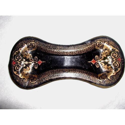 Beautiful black metal tole hand painted snuffer tray from England C.1880 was used to place the candle snuffer on after extinguishing candles. As was usually hot and sooty,the tray protected the table top. Bow tie shaped with gilt,red and cream painting,easily has other applications today. Slight wear to gilt painting on edges,otherwise excellent condition. Measures 10L X 4.5W X .50H.