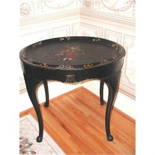 Additional pictures available. High legs on this oval tole tray table with wide scrolled apron and fan carved design center of the four sides is perfect height for a side table or center table as opposed to the lower coffee table height most found. Dates from the 18th century,England,with a gorgeous black background oval metal tray with floral hand painting in the center of deep red,lavender,blue,cream and green. Although not signed,the quality is evident in the down turned metal lip embellished with dainty gilt painting and inlaid with mother of pearl which is all intact as seen in a Jennens Bettridge piece. Extremely sturdy piece with tray fitting snugly over the frame,the hand made table itself a work of art in construction. Due to the age of this 18th century piece,slight lose to small areas of the black background paint. This has been addressed with these areas painted in matching opaque black and sprayed with an invisible clear coating to prevent any future lose. The stand in wonderful condition as well. Stunning piece. Measures 31L X 26.5W X 28H to top of raised lip,27 to table height.