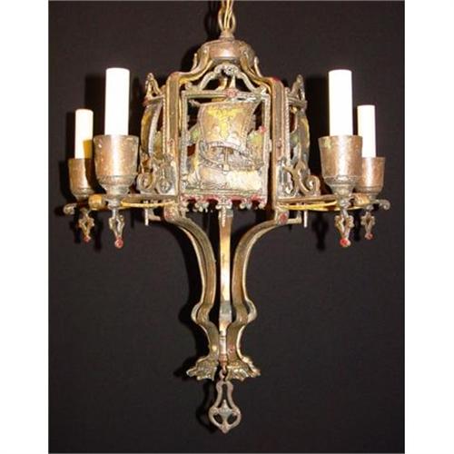 Circa 1910 Tole five light chandelier in bronze.Please email us if you would like more pictures or information.Thanks antique lighting gallery.