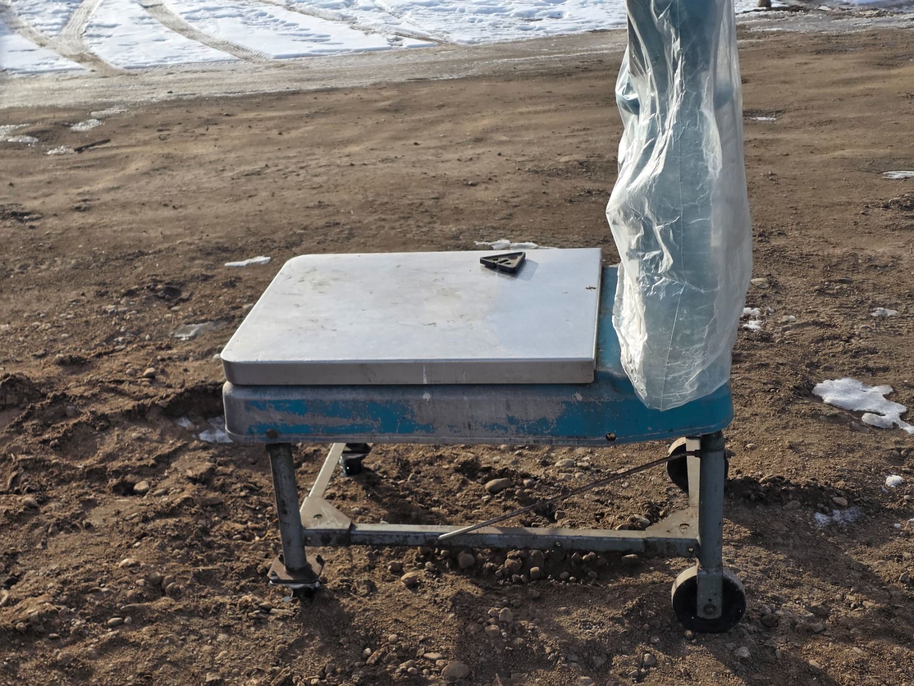Toledo Butcher Scale, mechanical, turquoise, up to 250lbs on dial, plus 150lbs (400lbs total) (and weight on top to zero it off), with stainless steel platform top