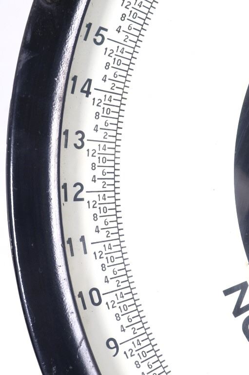 Featured in this lot we have a Toledo No Springs Honest Weight Industrial scale originating from 1910's to early 1930's. The piece displays a sturdy steel frame, scale bed, sliding counterweight system, and mobile cart. The scale is designed to be accurate to the ounce with a total weight of fifty pounds on the scale face before using the counter balance. The face of the piece is marked "Toledo Reg U.S. Pat. Office No Springs - Honest Weight Toledo Scale Company, Toledo, Ohio, U.S.A." across the center with "Weight Control 1 Ounce Graduation" towards the bottom. The center of the piece shows a indicator arm attached to a set of weights and pulleys. The front of the scale shows a metal plate with patent numbers. The front of the piece shows a locking lever to lock the scale bed. The piece shows good condition overall with some wear due to age and use. The scale measures 79" tall by 24 1/4" wide and 29 1/4" deep.