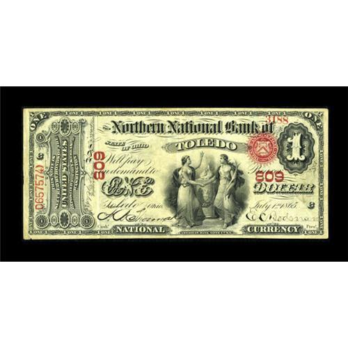 <B>Toledo, OH</B></I> - $1 Original Fr. 380 <B>The Northern NB</B></I> Ch. # 809<BR> This is the only Original Series ace in the census for this Lucas County bank. Embossing of the bank title is fully visible on the back of the note. Full margins, a cherry red seal and charter numbers, and fresh, original paper add to this note's overall eye appeal. Beautifully pen-signed <B>Very Fine-Extremely Fine.</B></I> <BR><BR><b>Shipping:</b> Coins & Currency (<a target="_blank" href="http://www.heritageauctions.com/common/shipping.php">view shipping information</a>)