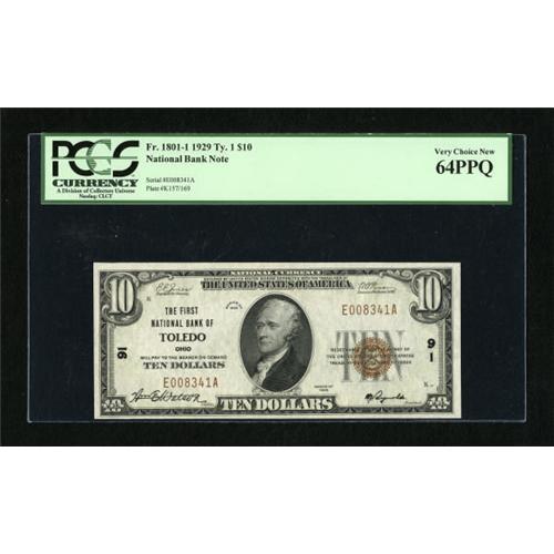 <B>Toledo, OH</B></I> - $10 1929 Ty. 1 <B>The First NB</B></I> Ch. # 91<BR> The margins are a bit off on this boldly printed and strongly embossed note. <B>PCGS Very Choice New 64PPQ</B></I>.<BR><BR><b>Shipping:</b> Coins & Currency (<a target="_blank" href="http://www.heritageauctions.com/common/shipping.php">view shipping information</a>)
