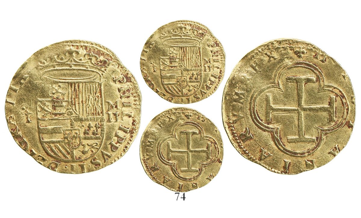 Toledo, Spain, cob 2 escudos, Philip II, assayer M above denomination II to right, mintmark oT to left. CT-85. 6.72 grams. Exceptionally broad, thin flan with choice full inner details and nearly full legends (the full PHILIPPVS II particularly impressive), AU- with small spots of encrustation.
