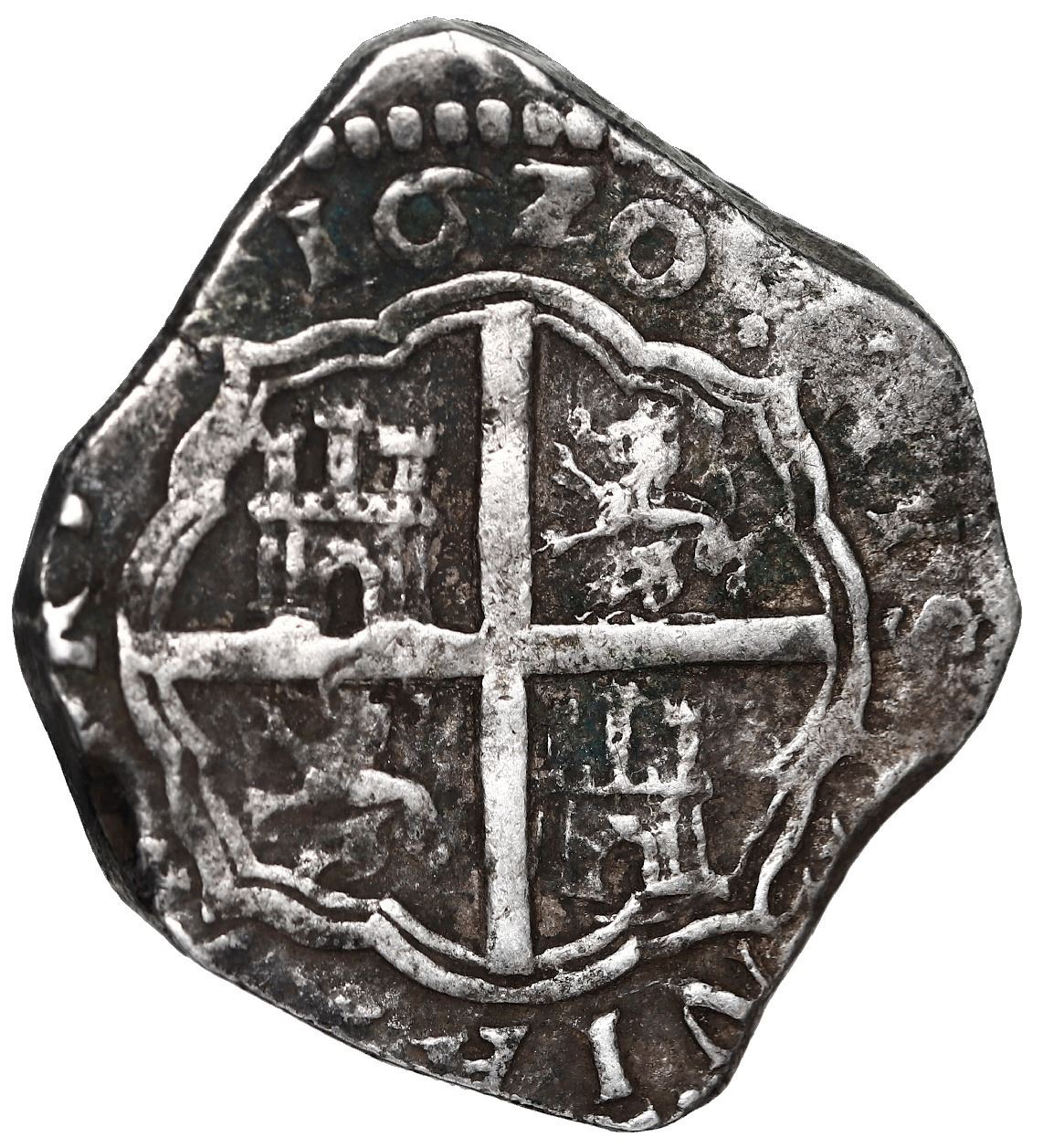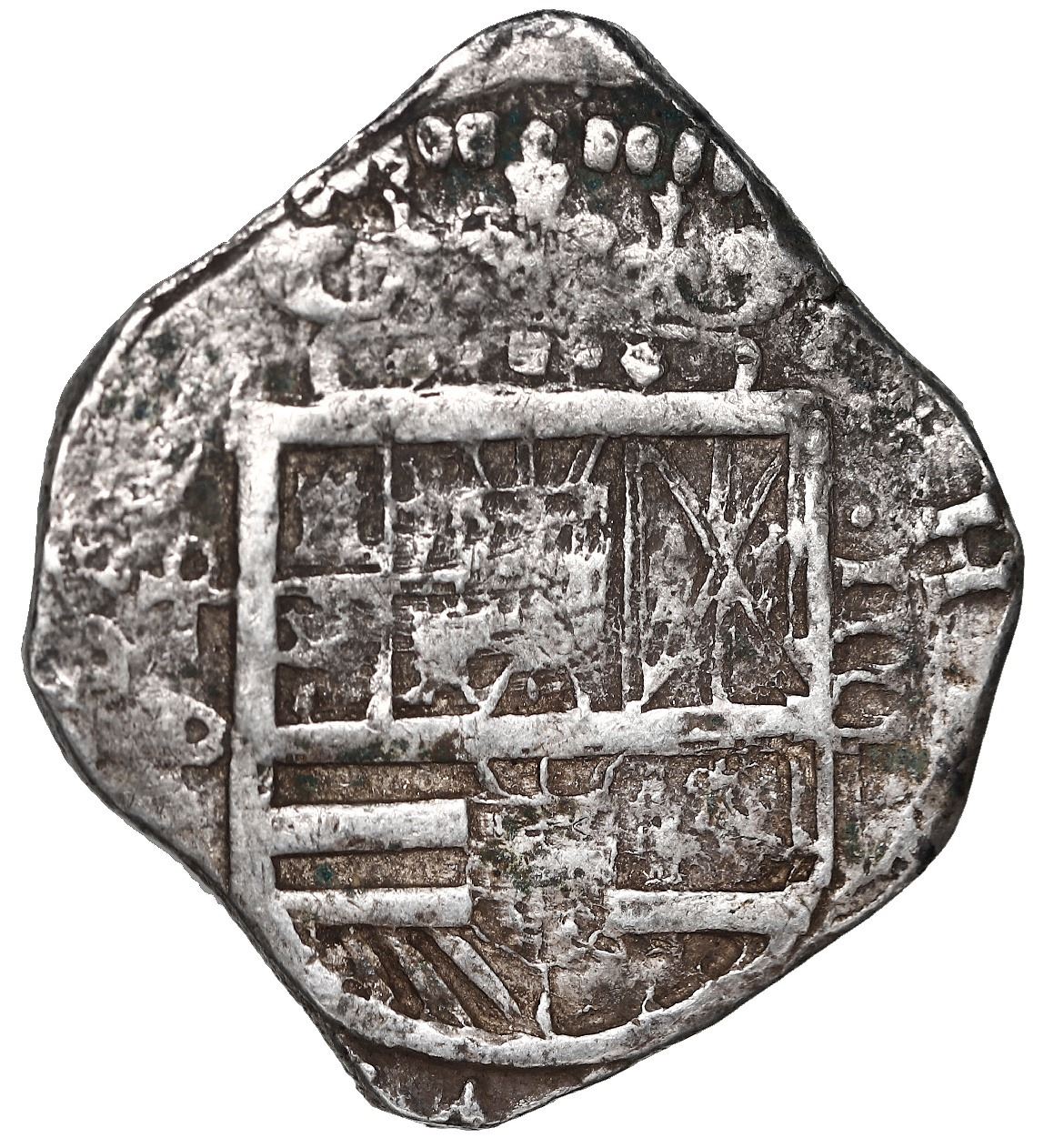 Toledo, Spain, cob 4 reales, 1620 P. Cal-858; KM-36.3. 13.45 grams. Choice full cross-and-tressure with bold full date above, the shield also complete, dark crusty toning, VF+.