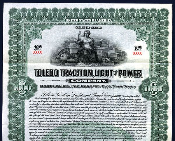 Ohio (Incorporated in Maine). 1913. $1000 6% Specimen Bond. Black on green border and underprint. Allegorical figure top center holding light bulb. POC's and red SPECIMEN overprints. VF condition. FLBNC.