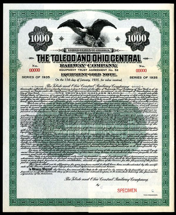 1920. $1000 Specimen Bond. Black print with green border and underprint. Vignette of Bald Eagle top center. POC's and red SPECIMEN overprint. VF condition. ABNC. Listed railroad but unlisted bond.