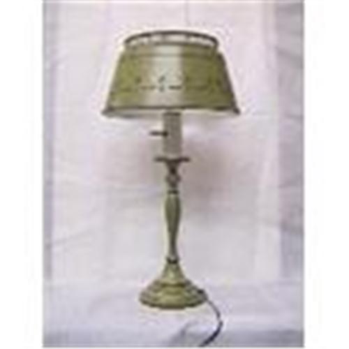 This is A beautiful Toleware Green Lamp in A shape of candlestick and there is A hand painted Toleware Shade on top. It is in good condition (small scratch on the base). H: 20" to the top of shade- W:on the shade 10.1/2"- W: 5" on the base.