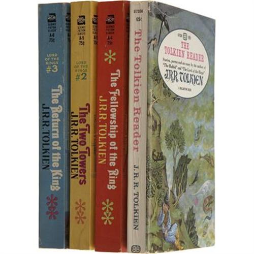 <B>J. R. R. Tolkien: "Lord of the Rings" and Reader. </B></I> Includes the following:<BR><B><I>The Tolkien Reader.</B></I></B></I> (New York: Ballantine Books, 1966), first edition, 277 pages, fully illustrated wraps, 12mo. Condition: good.<BR><B><I>The Fellowship of the Ring.</B></I></B></I> (New York: Ace Books, 1966), first paperback edition thus, 448 pages, red wraps with illustration, 12mo. Condition: very good.<BR><B><I>The Two Towers.</B></I></B></I> (New York: Ace Books, 1965), first paperback edition thus, 381 pages, yellow wraps with illustration, 12mo. Condition: very good.<BR><B><I>The Return of the King.</B></I></B></I> (New York: Ace Books, 1965), first paperback edition thus, 444 pages, light blue wraps with illustration, 12mo. Condition: good.<BR><BR><b>Shipping:</b> Books & Catalogs (<a target="_blank" href="http://www.heritageauctions.com/common/shipping.php">view shipping information</a>)