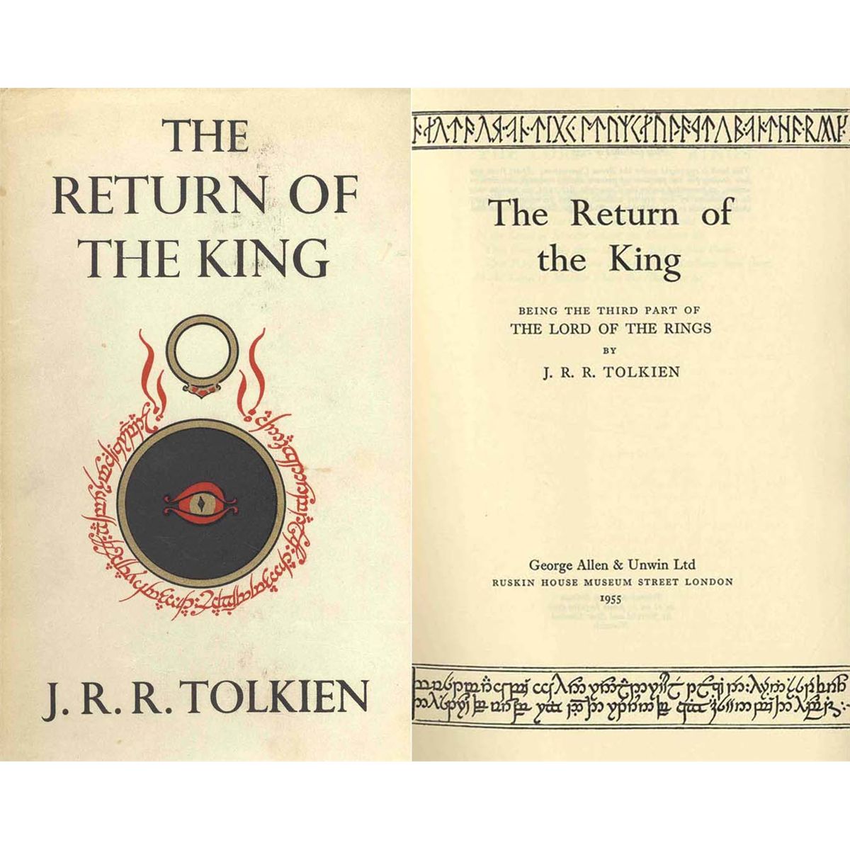 Rare first edition, first impression, third state of J.R.R. Tolkien's ''The Return of the King,'' published in 1955 by George Allen and Unwin. Third state copy, with the signature mark ''4''. In the original publisher's unclipped dustjacket. 6'' x 9'' book is slightly cocked and toned, otherwise fine. Jacket is unrestored and shows very well with only sunning to spine and very light chipping. Folding map present and in exceptional condition. The opportunity to own a very attractive early printing from Tolkien's famed trilogy.