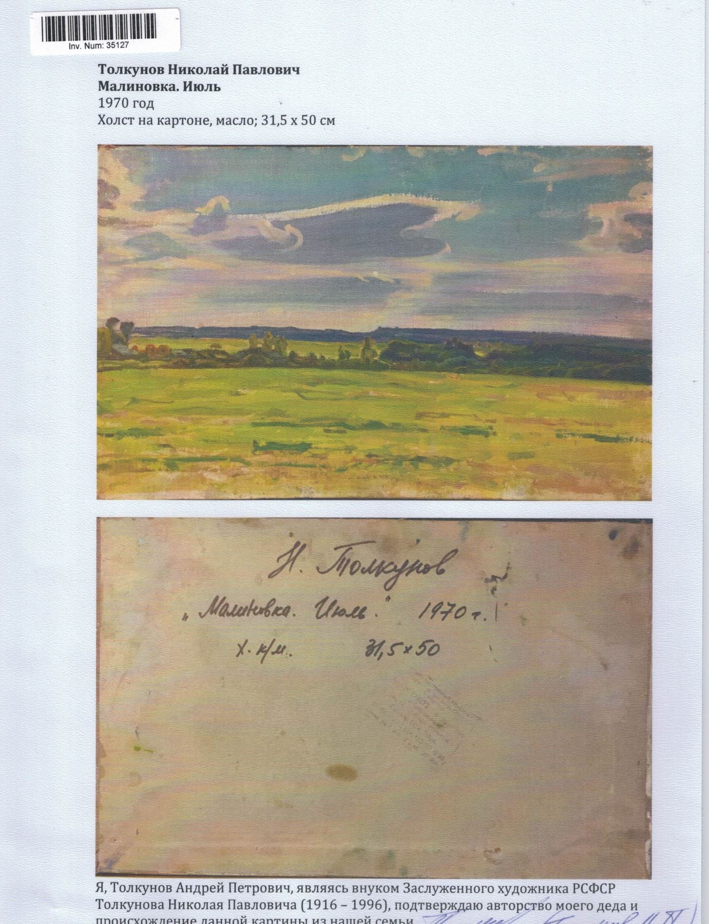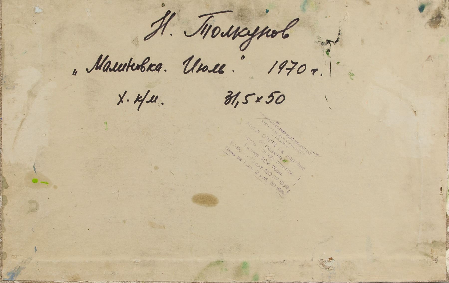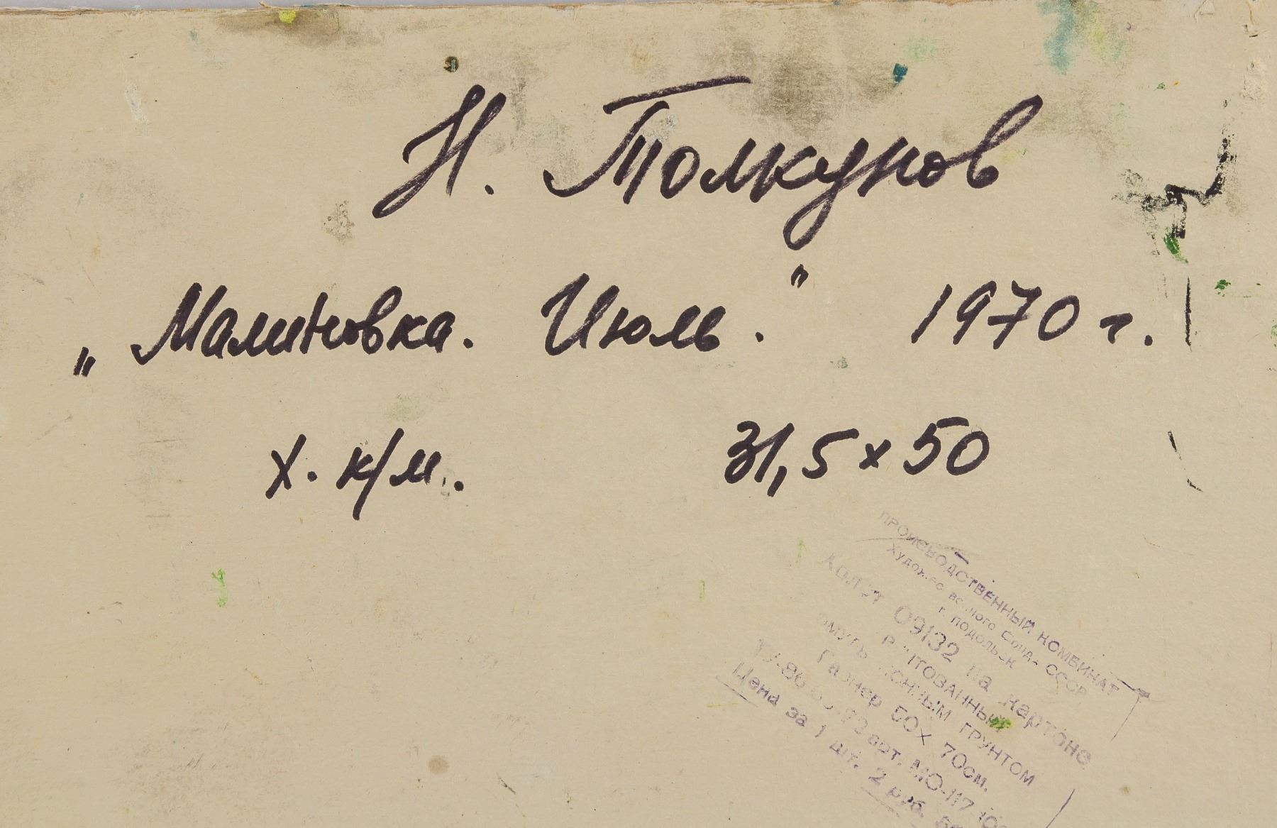 Oil on cardboard painting, entitled "Malinovka July" and dated 1970 with dimensions in Cyrillic, verso. Unsigned by Tolkunov Nikolay Pavlovich (1917-1996, Russian). 31.5 x 50 cm (12.4 x 19.7 in). Accompanied by a certificate of authenticity from Tolkunov Andrei Petrovich, grandson of the artist, Tolkunov Nikolay Pavlovich. Tolkunov Nikolay Pavlovich was an honored artist of the RSFSR. In 1942 graduated from Moscow Art Institute, studied under S.V. Gerasimov. Participated in all-union, republican and regional art exhibitions since 1938. Gave lectures at V.I. Surikov Moscow State Art Institute since 1960. The works of the artist are exhibited in the Russian State Museum, in many regional museums, and in collections abroad. Provenance: Private Russian collection. Acquired by the present owner from the artist's family