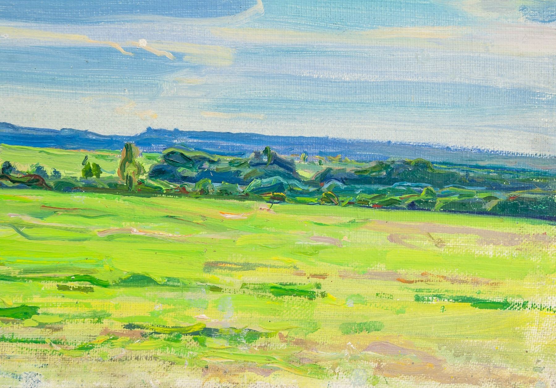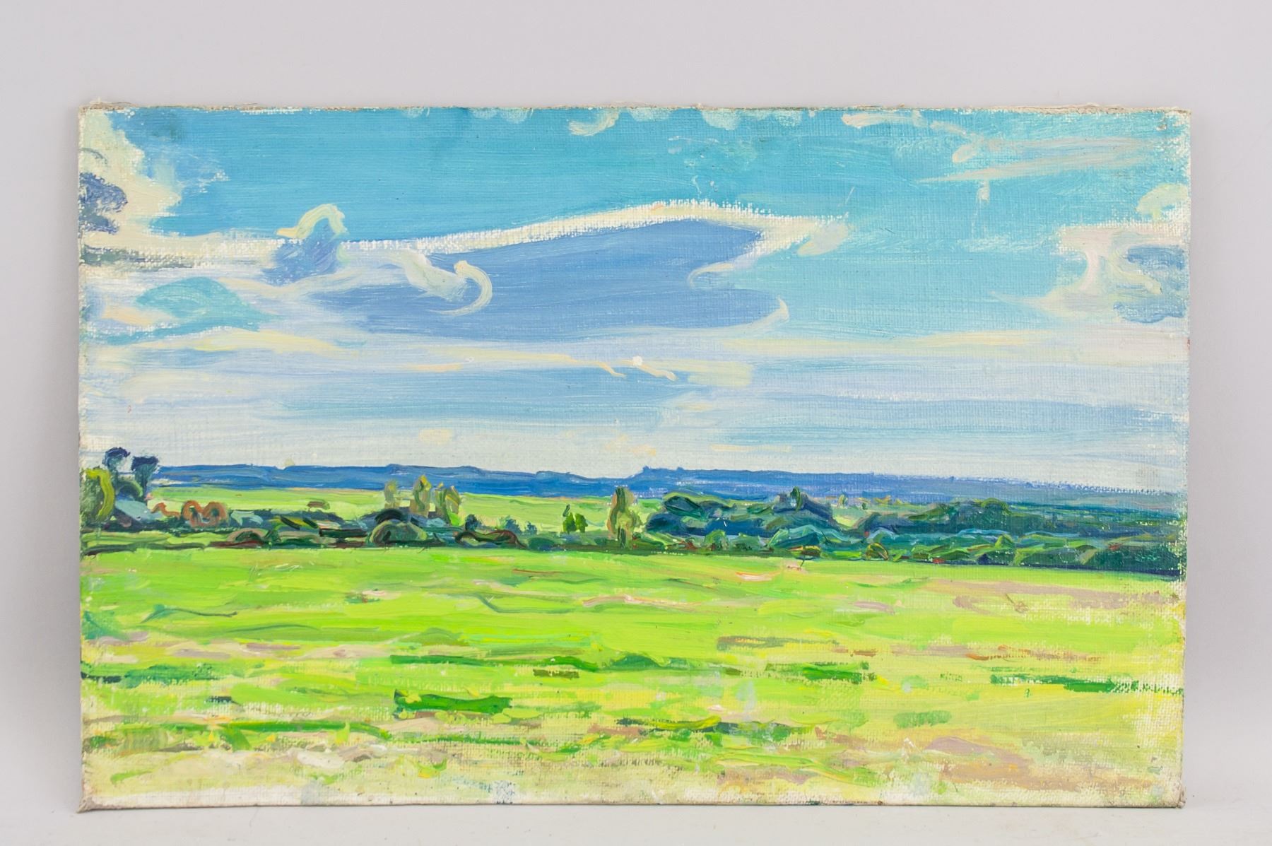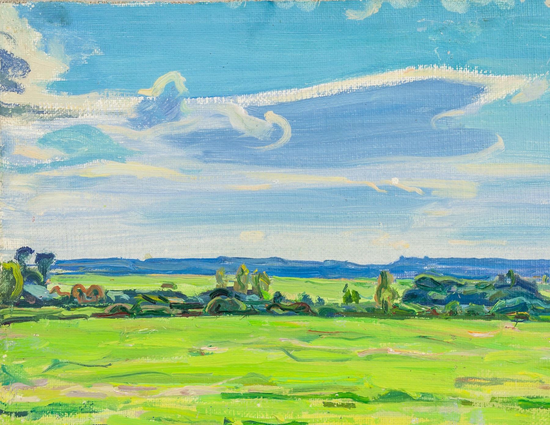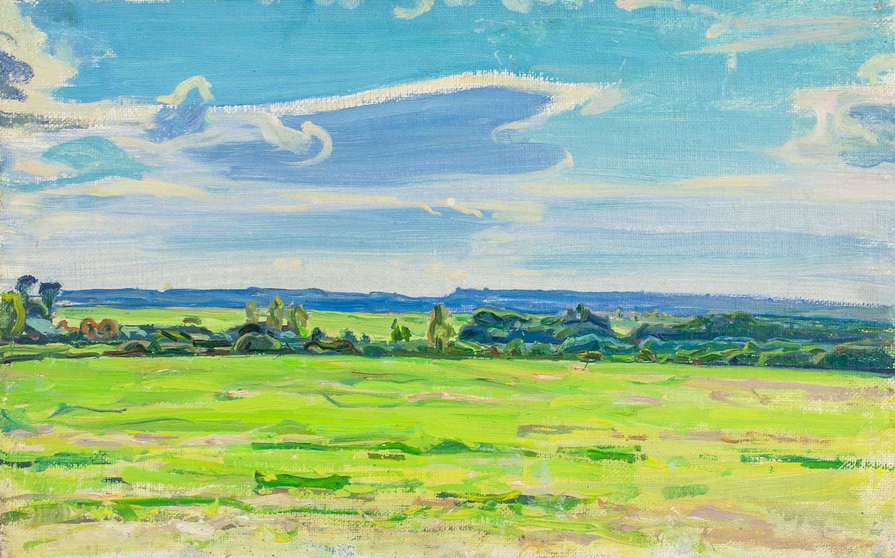 Oil on cardboard painting, entitled "Malinovka July" and dated 1970 with dimensions in Cyrillic, verso. Unsigned by Tolkunov Nikolay Pavlovich (1917-1996, Russian). 31.5 x 50 cm (12.4 x 19.7 in). Accompanied by a certificate of authenticity from Tolkunov Andrei Petrovich, grandson of the artist, Tolkunov Nikolay Pavlovich. Tolkunov Nikolay Pavlovich was an honored artist of the RSFSR. In 1942 graduated from Moscow Art Institute, studied under S.V. Gerasimov. Participated in all-union, republican and regional art exhibitions since 1938. Gave lectures at V.I. Surikov Moscow State Art Institute since 1960. The works of the artist are exhibited in the Russian State Museum, in many regional museums, and in collections abroad. Provenance: Private Russian collection. Acquired by the present owner from the artist's family
