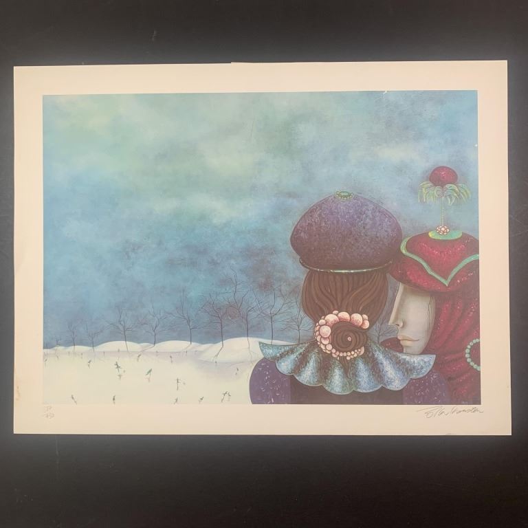 A Toller Cranston limited edition print, signed lower right and numbered 387/950 lower left. This piece is of two women watching people skate on a pond from afar. This piece is in almost great condition with some soiling at left, wrinkles lower right, and very small incision lower right.