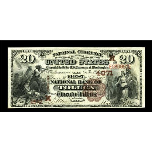 <B>Toluca, IL</B></I> - $20 1882 Brown Back Fr. 499 <B>The First NB</B></I> Ch. # (M)4871<BR>A superlative item originally sold as part of the Shaw collection in January of 2000. This is one of three notes known from this bank, which issued Brown Backs only during its brief twelve year run. Just three notes are known, with this example the finest. <B>About Uncirculated,</B></I> a wonderful combination of rarity, grade, and desirability.<BR><I>From The Lincoln Collection</B></I><BR><BR><b>Shipping:</b> Coins & Currency (<a target="_blank" href="http://www.heritageauctions.com/common/shipping.php">view shipping information</a>)