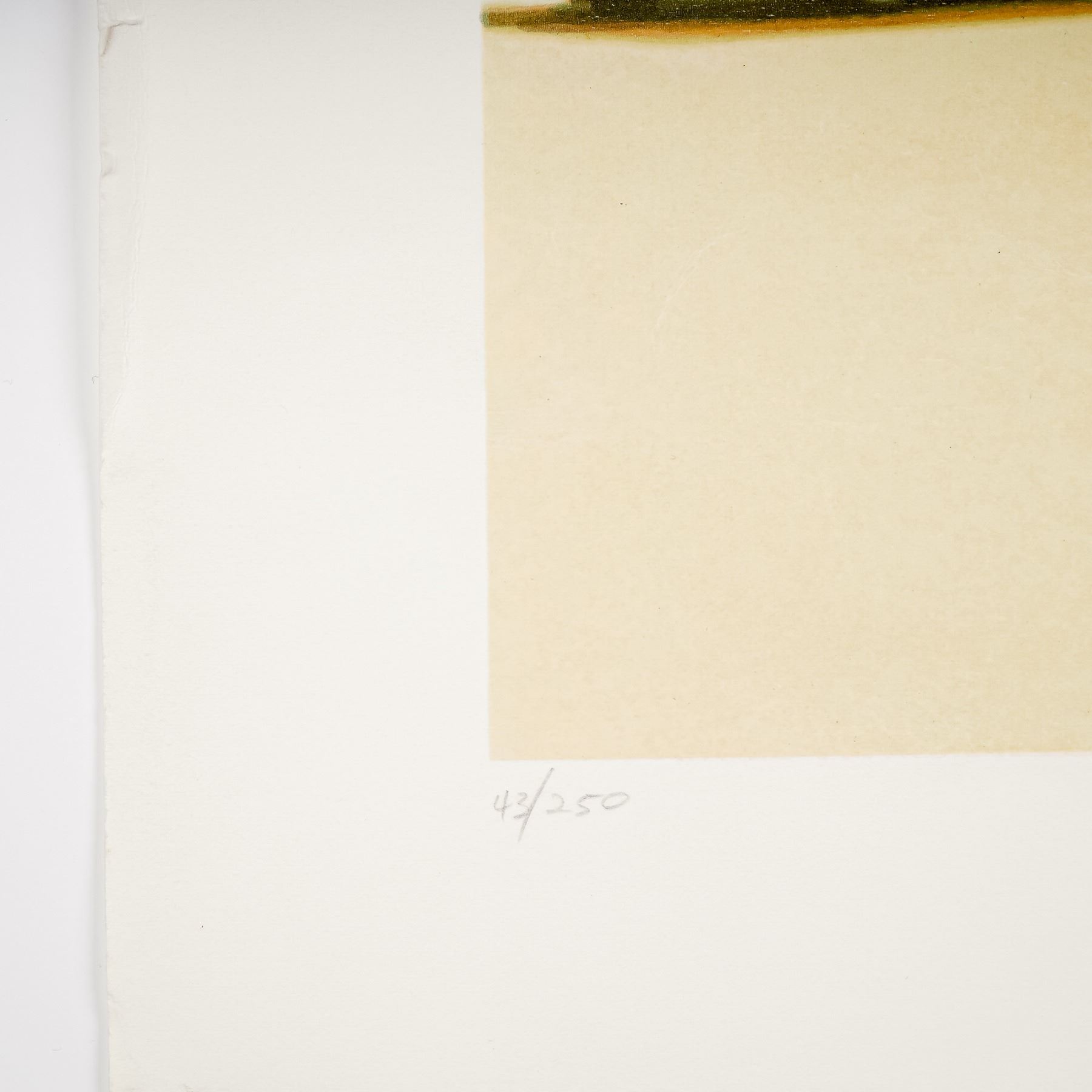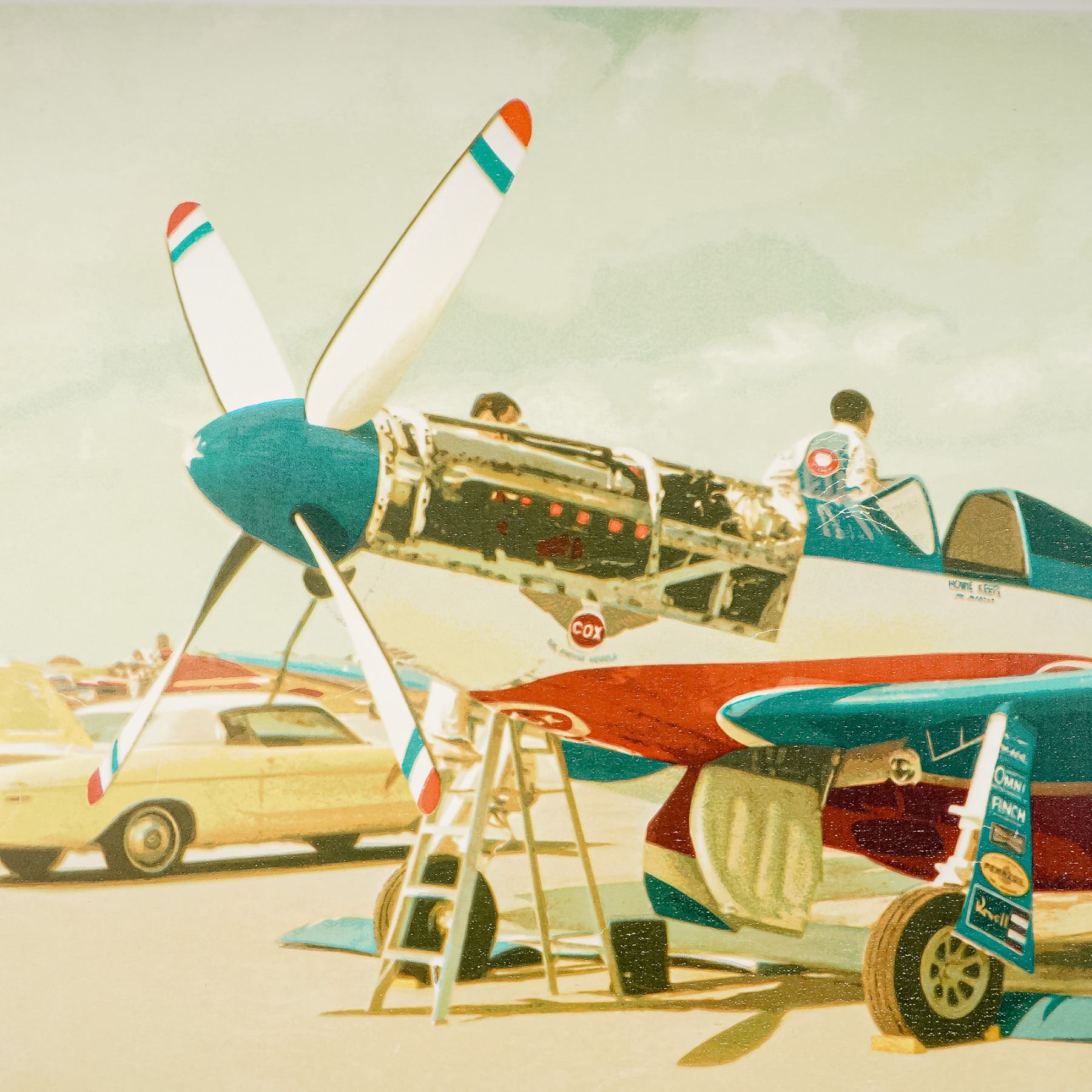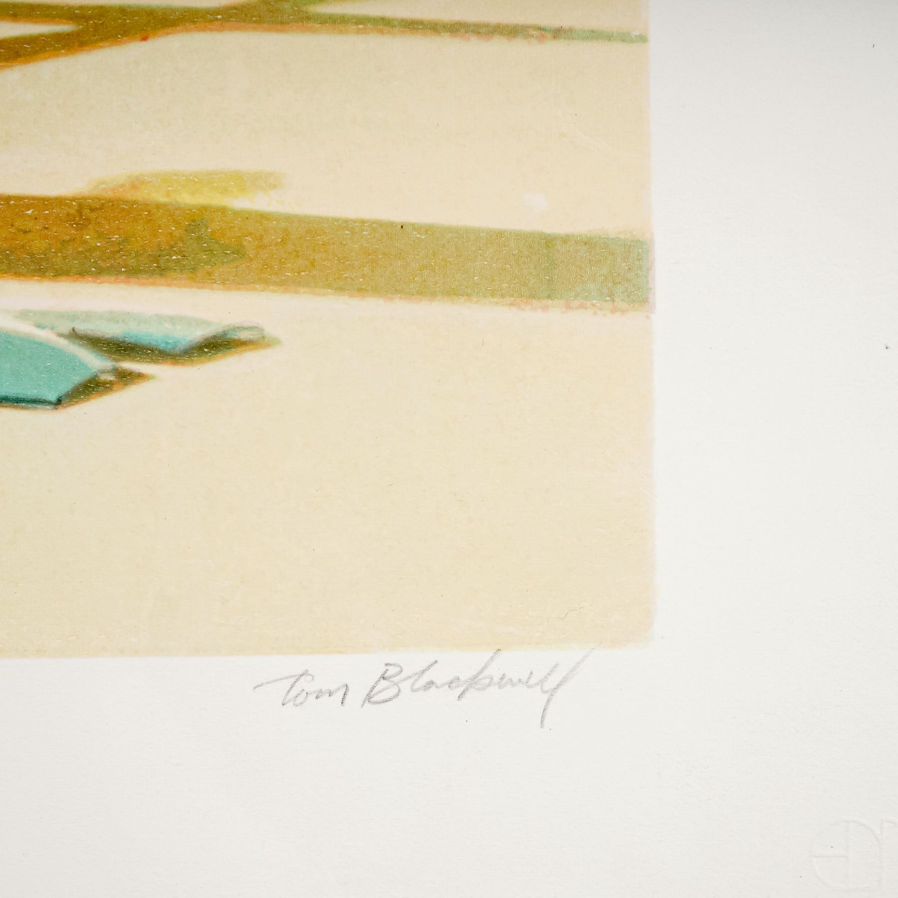 A dynamic serigraph on paper by renowned Photorealist painter Tom Blackwell, celebrated for his vivid depictions of American icons, machinery, and culture. Titled Red, White & Blue Mustang, this print captures the raw power and sleek beauty of a classic P-51 Mustang aircraft, rendered in patriotic colors with meticulous detail. The work embodies Blackwell's fascination with the gleam and energy of machines as symbols of modern America. The crisp colors and composition highlight the technical brilliance of Blackwell's printmaking, offering both collectors of aviation art and admirers of Photorealism a truly iconic image. This serigraph is pencil-signed by the artist at the lower right, numbered 43/250 at the lower left, and bears the embossed printer's stamp adjacent to the signature.
