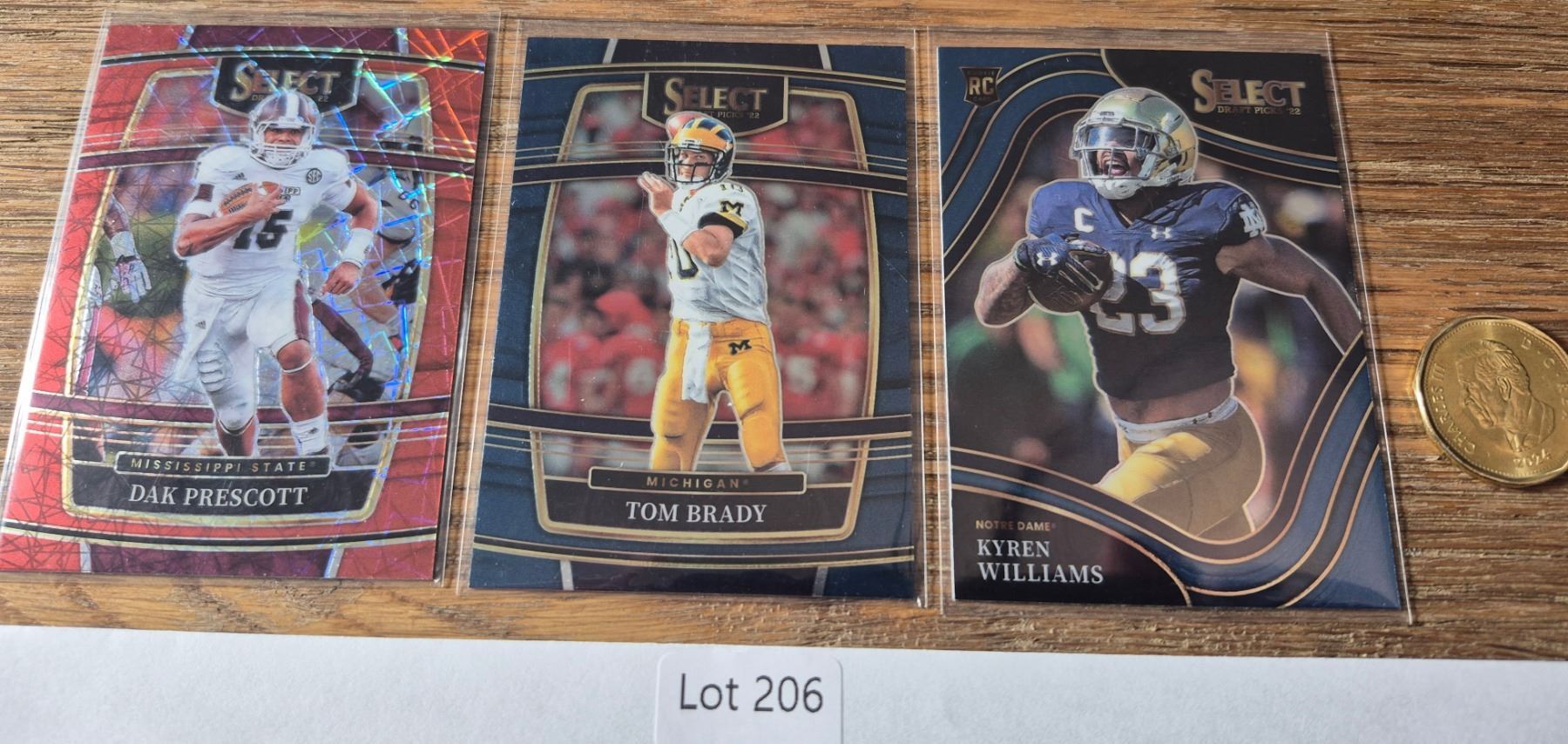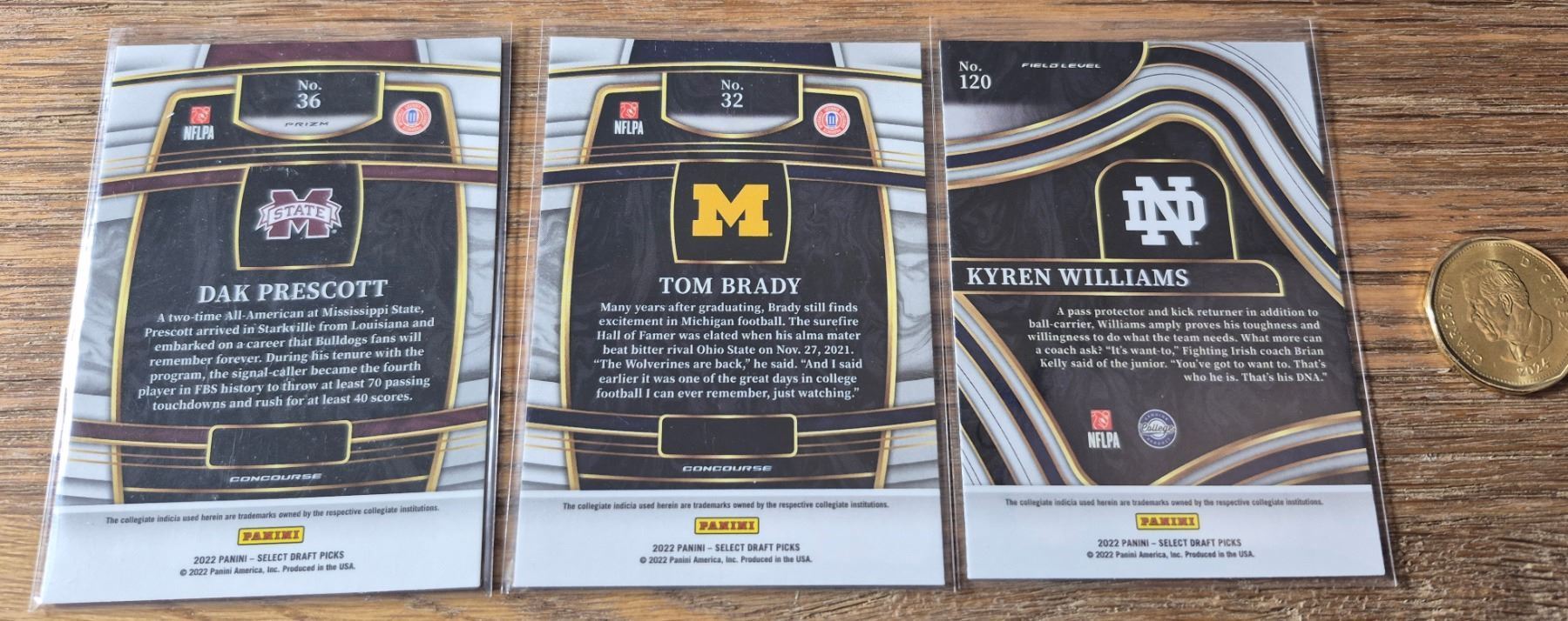 Three 2022 Select Draft Picks cards featuring Tom Brady, Dak Prescott, and Kyren Williams. All cards in excellent to mint condition.