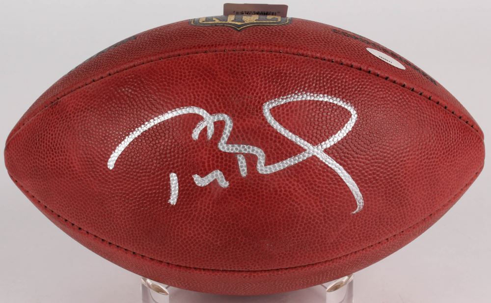 Wilson "The Duke" Official NFL Game Football. Hand-signed and inscribed in silver paint pen by Tom Brady (Patriots).